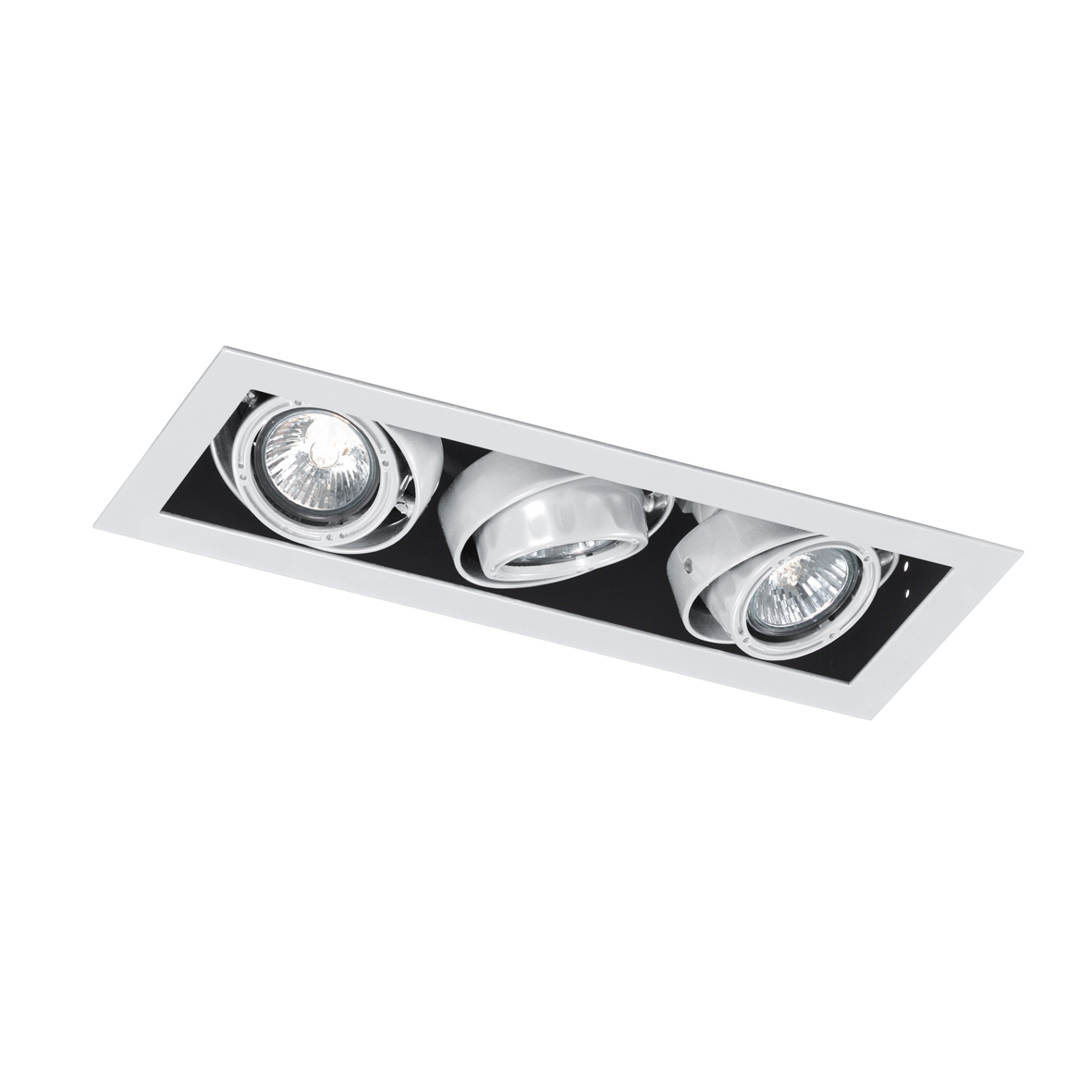 Faretto quadrato ad incasso cardanico, orientabile su due assi di ? 40?/90? con attacco GU10 che consente di montare lampadina LED, alogena o a risparmio energetico. Struttura in metallo verniciato, proposto in due finiture (bianco e grigio). Disponibile nella versione a uno, due o tre elementi.