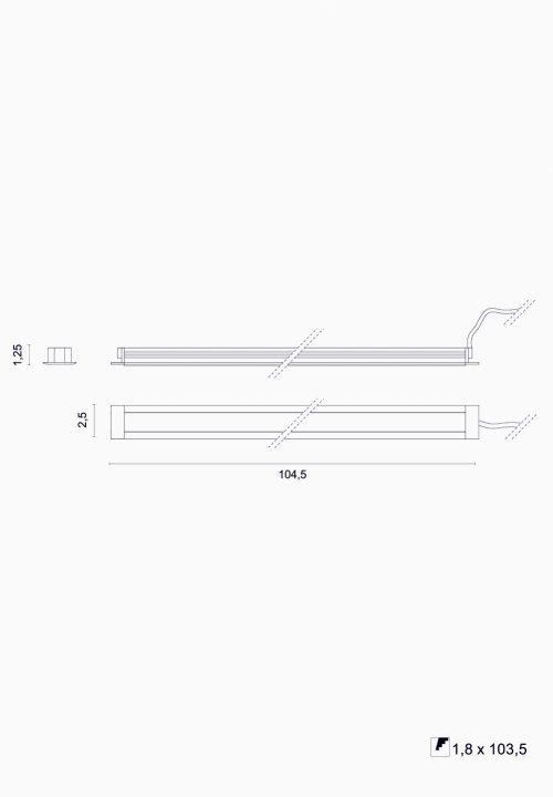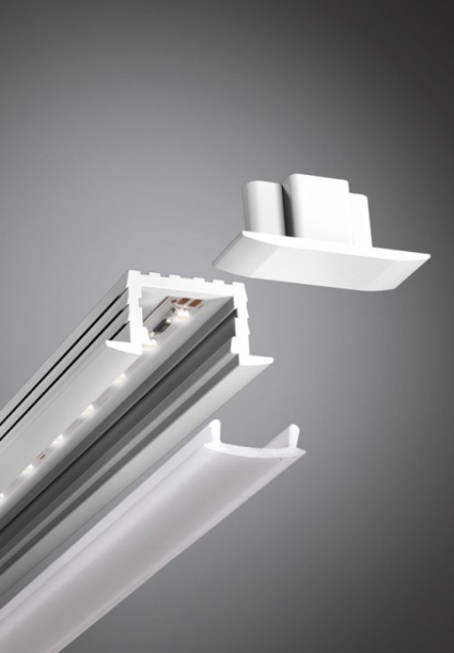 Profilo lineare da incasso in mensole a luce LED diffusa di ridottissime dimensioni. Dissipatore in alluminio verniciato bianco RAL 9016 (.01) o anodizzato (.45), schermo in policarbonato opale, testate terminali in ABS verniciate.