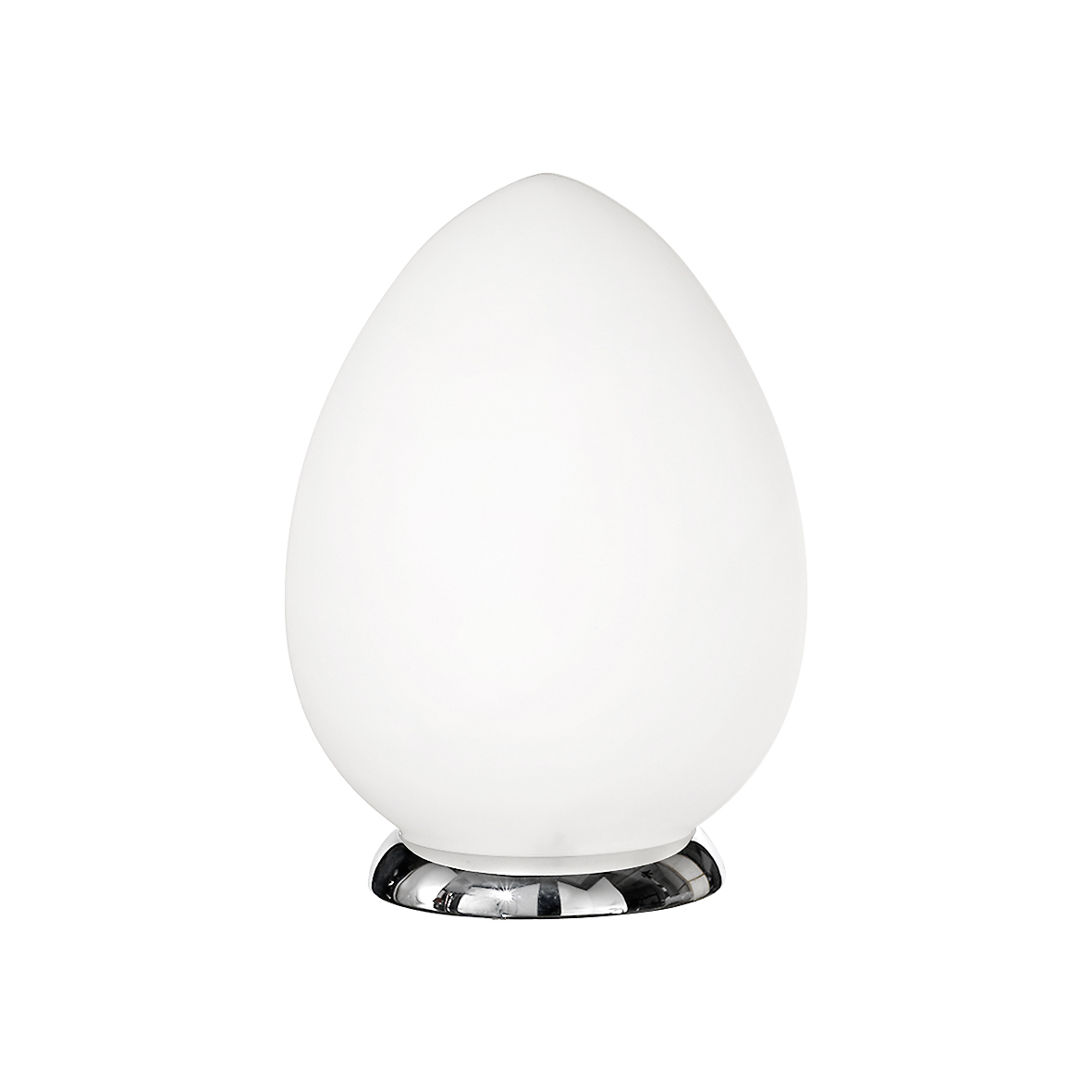 Lampada a sospensione, da parete e da tavolo in vetro soffiato bianco satinato. Struttura e particolari in metallo cromato. Cablata con attacco E27 che consente di montare lampadina LED.