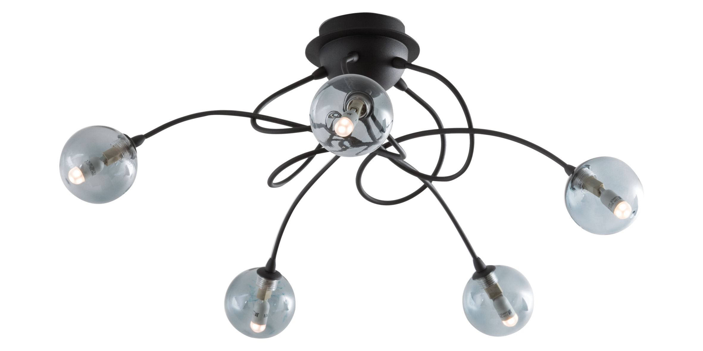 Lampada a sospensione, soffitto, da parete e da tavolo con struttura a forma di ricciolo in metallo, proposta nelle finiture oro satinato e nero. Diffusori a forma sferica in finitura bianco satinato per la struttura oro, fum? per la struttura nera. Cablata con attacco G9 che consente di montare lampadina a LED.
