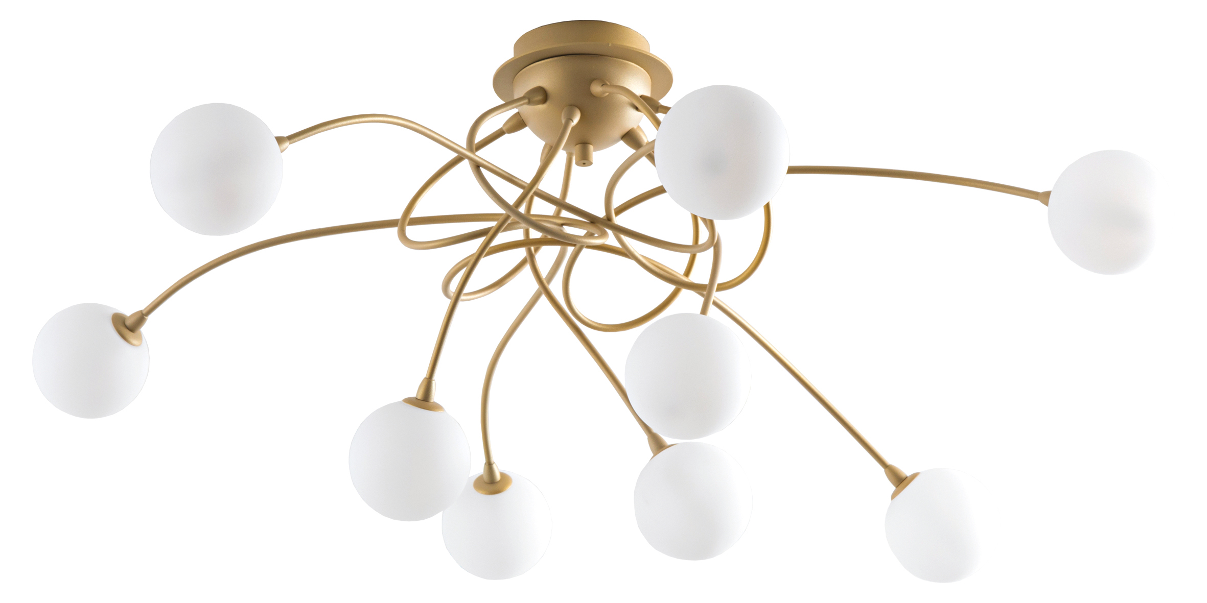 Lampada a sospensione, soffitto, da parete e da tavolo con struttura a forma di ricciolo in metallo, proposta nelle finiture oro satinato e nero. Diffusori a forma sferica in finitura bianco satinato per la struttura oro, fum? per la struttura nera. Cablata con attacco G9 che consente di montare lampadina a LED.