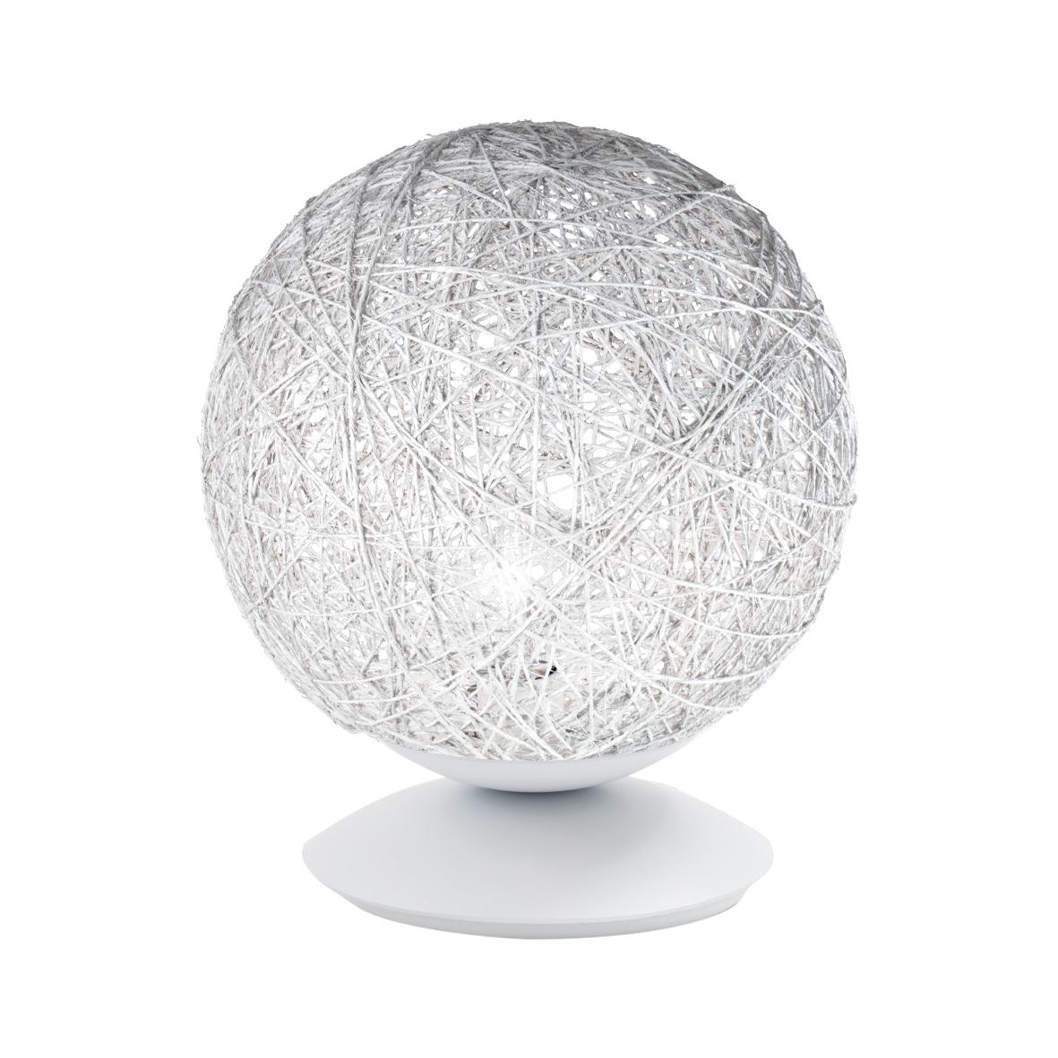 Lampada a sospensione e da tavolo dalla forma sferica in corda naturale colorata realizzata a mano, con struttura e rosone in metallo cromato. Disponibile in quattro finiture (giallo, rosso, bianco e blu)
