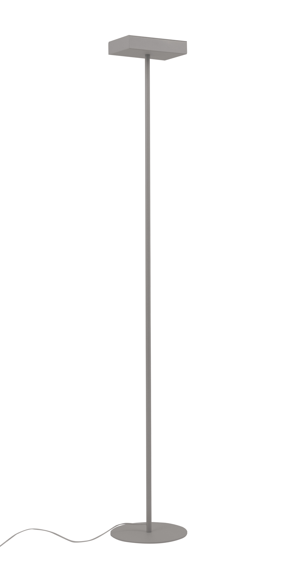 Lampada da terra a luce indiretta con attacco R7s (che consente di montare lampadine LED) con struttura in metallo laccato disponibile in finitura bianca, grigia e nera. Proposta in due versioni: con un portalampada, con riflettore orientabile e regolabile in altezza, cavo di alimentazione in tinta (trasparente nella finitura grigia)