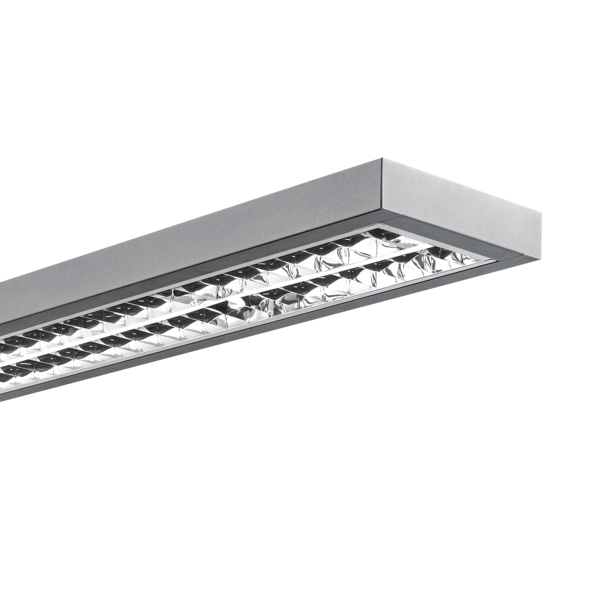 Apparecchio LED monoemissione a luce diretta per applicazione a soffitto (attacco a plafone incluso) o a sospensione (con kit sospensione e rosone). Struttura in lamiera di acciaio, verniciatura a fuoco con polveri epossidiche. Ottiche lamellari a doppia parabolicit? in alluminio speculare pre-anodizzato, con schermi in PMMA opale a protezione del LED, che consentono di raggiungere un UGR<19 per installazioni in ambienti con videoterminali. Alimentatore integrato. Disponibile in due lunghezze con relative potenze, due finiture (bianco e grigio) e due gradazioni colore (3000K e 4000K).
