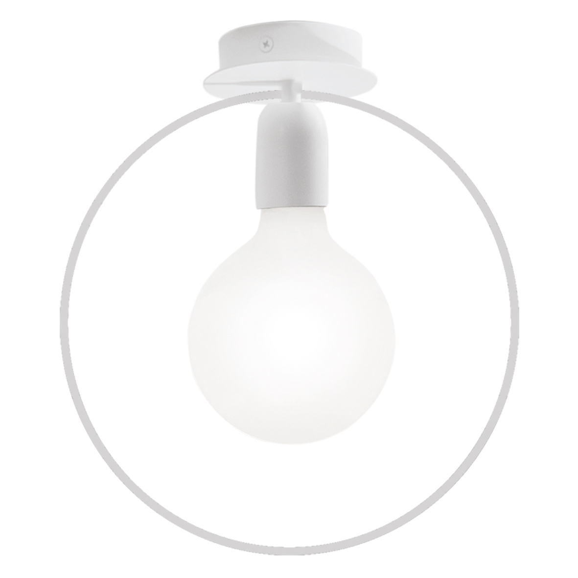 Lampada a sospensione e soffitto con struttura dalla forma circolare minimale in metallo, disponibile in finitura cromata, bianca e nera. Rosone in tinta con la struttura, cavo di sospensione trasparente per la versione cromo, in tinta per le finiture bianca e nera. Attacco E27 con lampadina a vista, che consente all’utente di montare una lampadina a sua scelta, personalizzando ulteriormente il prodotto.
