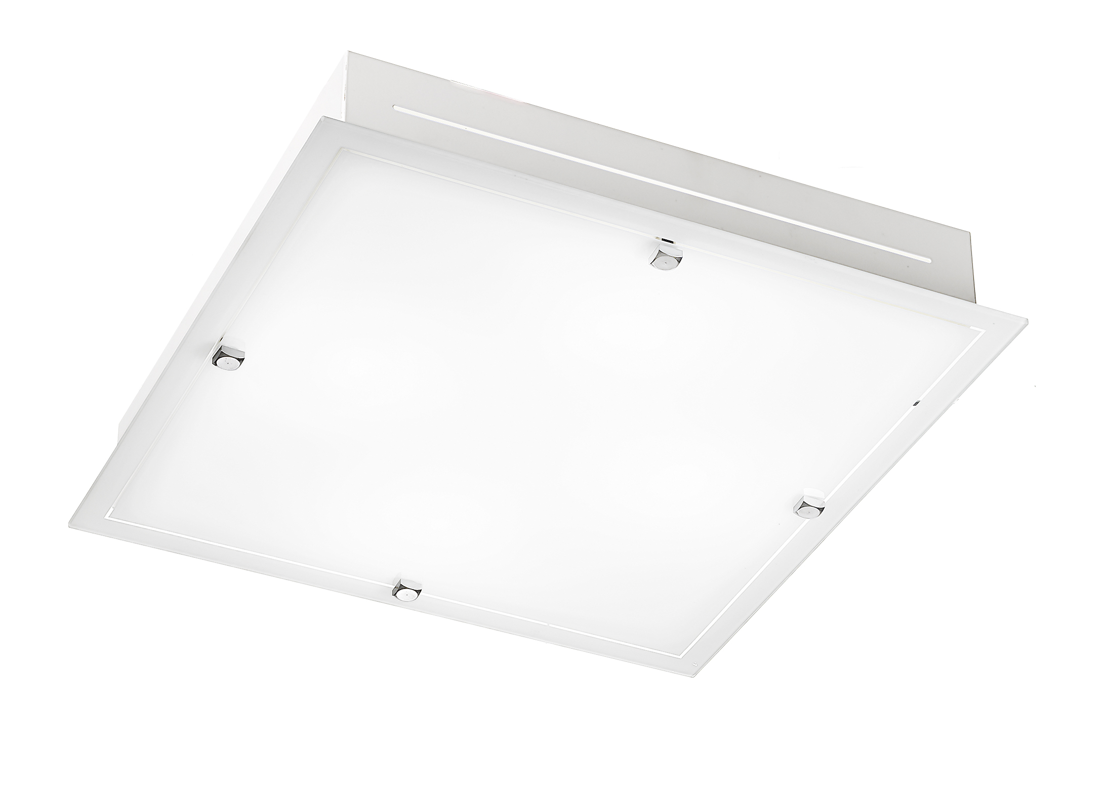 Lampada a soffitto e da parete in vetro bianco temperato con filo cristallo. Struttura metallica bianca opaca con tagli laterali per un particolare effetto di luce sulla parete di installazione, viti e particolari cromati. Proposta in diverse dimensioni e relative potenze, nella versione a LED (2700K) e con attacco tradizionale (E27) che consente di montare lampadina LED.
