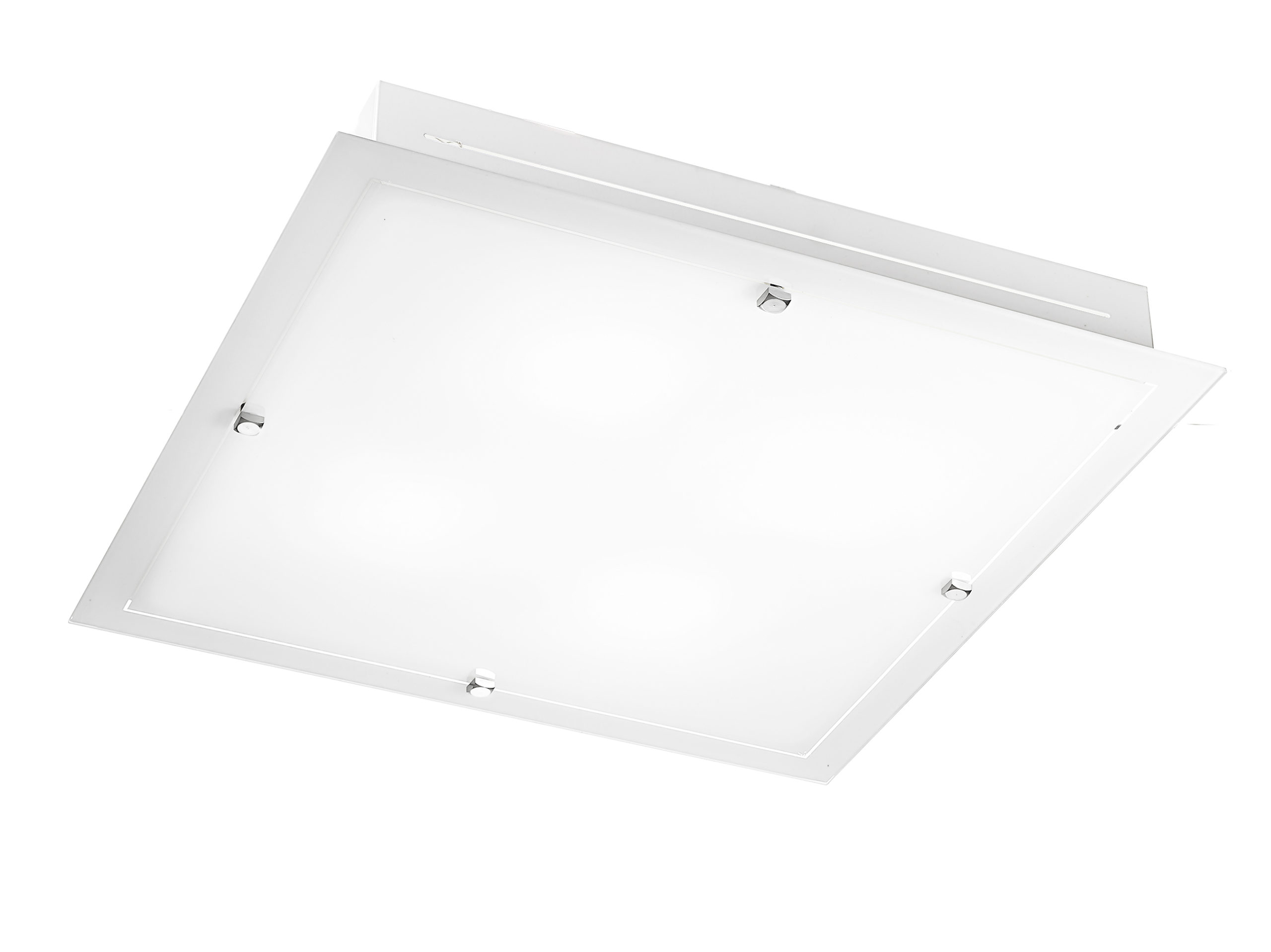 Lampada a soffitto e da parete in vetro bianco temperato con filo cristallo. Struttura metallica bianca opaca con tagli laterali per un particolare effetto di luce sulla parete di installazione, viti e particolari cromati. Proposta in diverse dimensioni e relative potenze, nella versione a LED (2700K) e con attacco tradizionale (E27) che consente di montare lampadina LED.