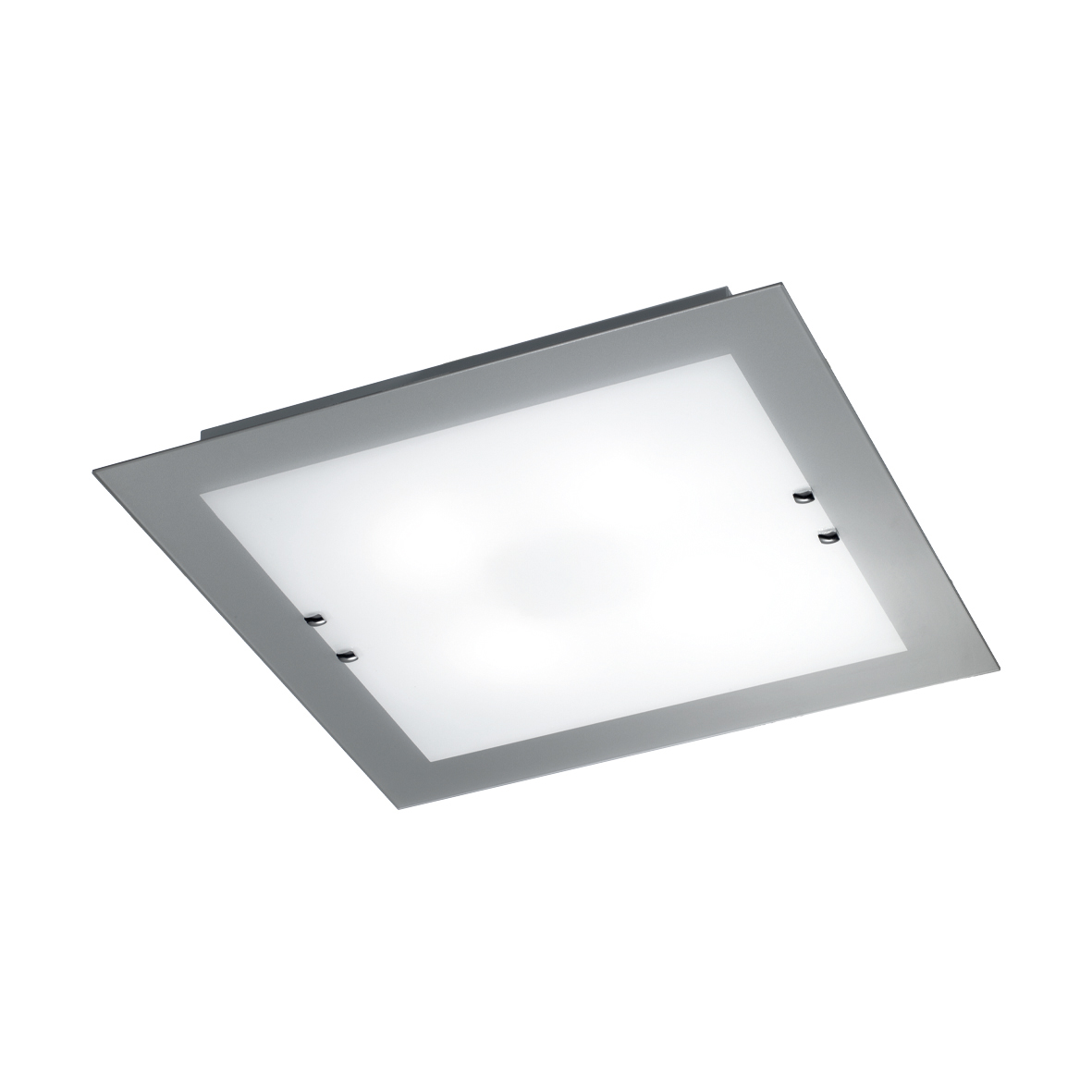 Lampada a soffitto e da parete in vetro extrachiaro lucido temperato con bordo colorato di bianco o grigio e particolari cromati. Cablata con attacco E27 che consente di montare lampadina LED.