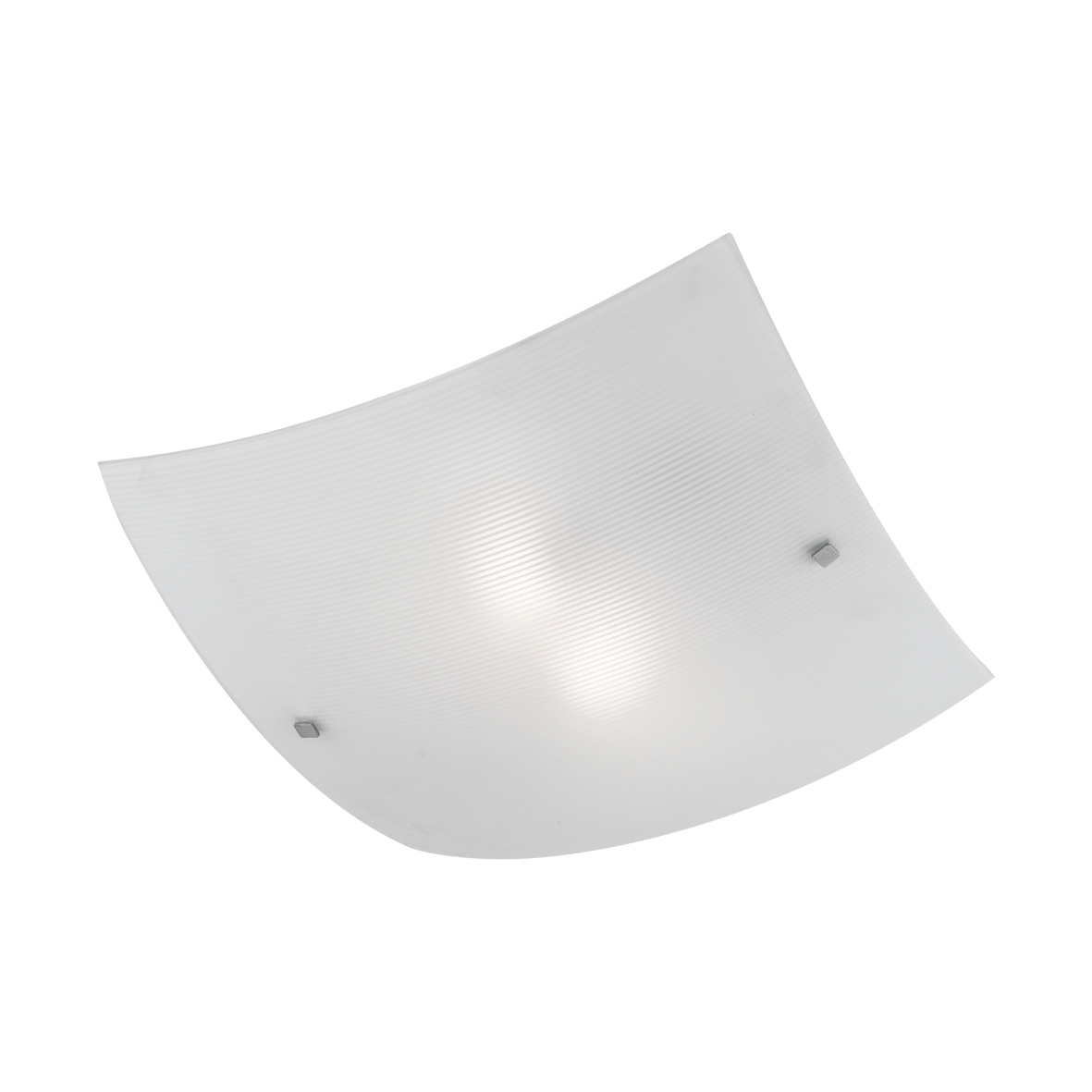 Lampada a sospensione, da parete e a soffitto in vetro satinato serigrafato. Struttura e particolari in metallo cromato.