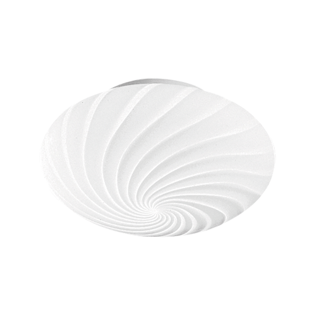 Lampada da soffitto e da parete con supporto in metallo verniciato e diffusore in vetro soffiato decorato rigadin. Disponibile in due misure, cablata con attacco E27 che consente di montare lampadina LED.