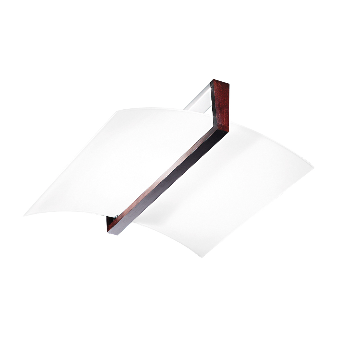Lampada a soffitto, da parete e da terra con diffusore in vetro satinato curvato. Struttura rivestita in legno weng?. Versione da terra con base cromata.