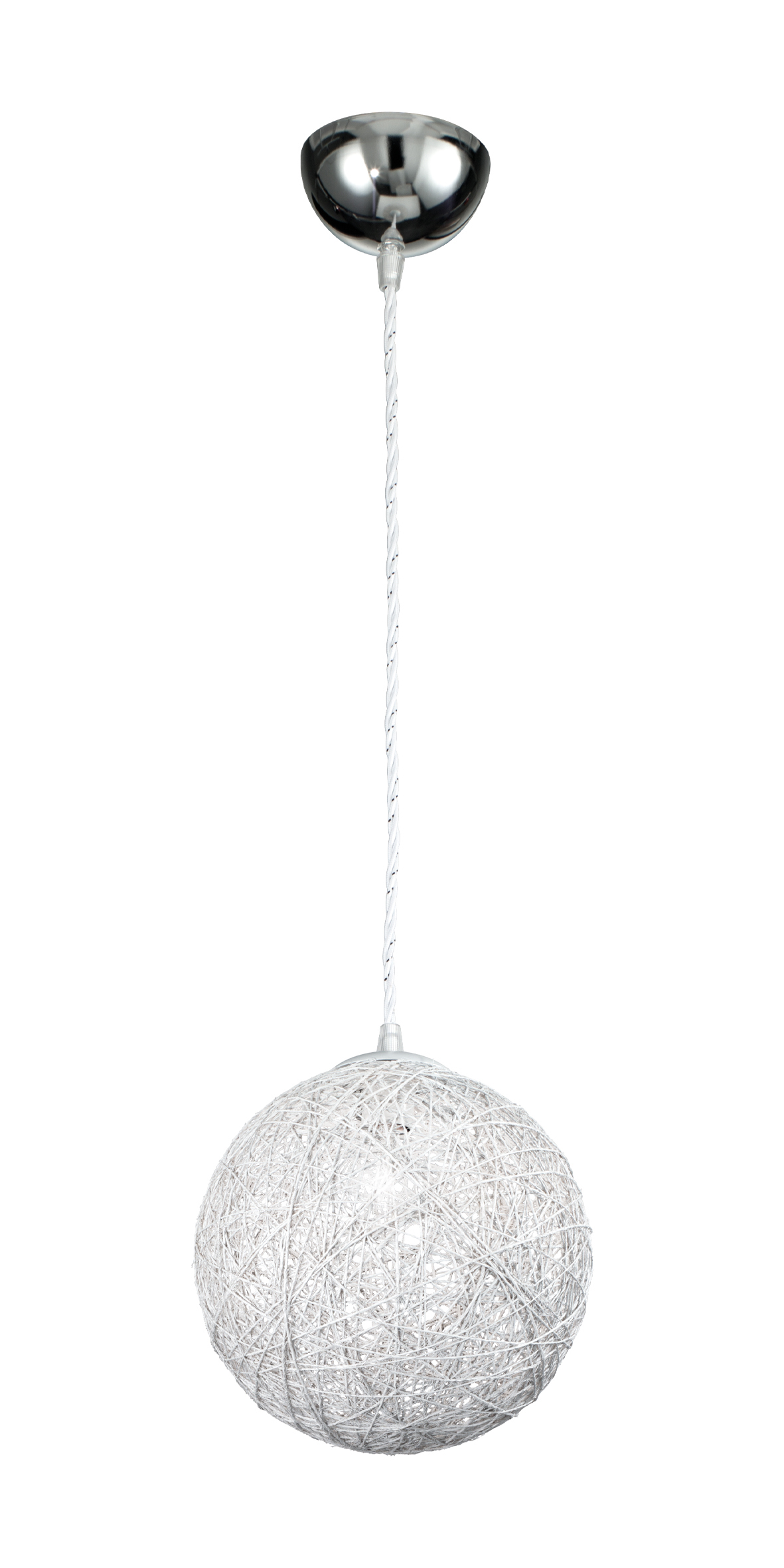 Lampada a sospensione e da tavolo dalla forma sferica in corda naturale colorata realizzata a mano, con struttura e rosone in metallo cromato. Disponibile in quattro finiture (giallo, rosso, bianco e blu)