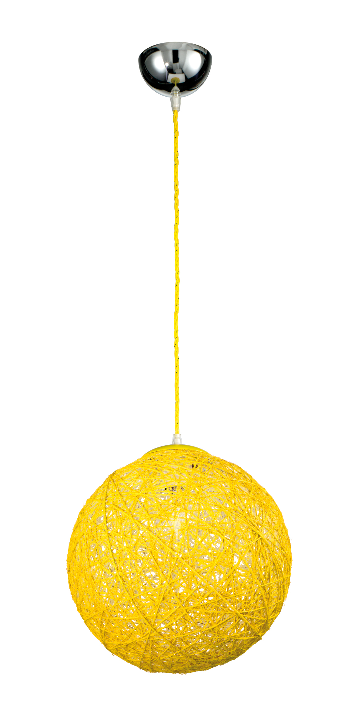 Lampada a sospensione e da tavolo dalla forma sferica in corda naturale colorata realizzata a mano, con struttura e rosone in metallo cromato. Disponibile in quattro finiture (giallo, rosso, bianco e blu)