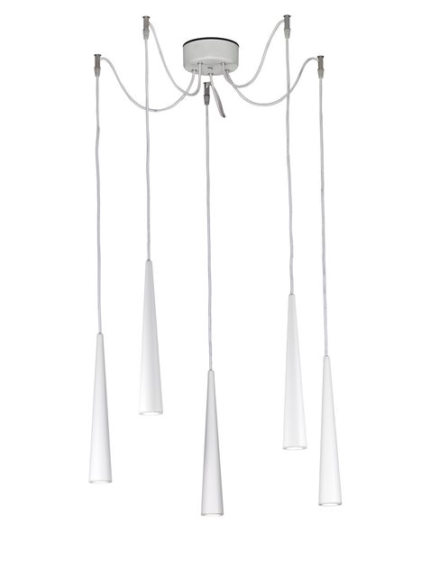 Sospensione a 1, 3 o 5 luci con struttura a forma di cono realizzata in metallo laccato nei colori bianco opaco e nero opaco. Particolari e cavo elettrico, rivestito in tessuto, in tinta con il corpo lampada. Proposta nella versione singola e con kit decentramento a tre o cinque elementi. Portalampada GU10 che consente di montare lampadina LED.