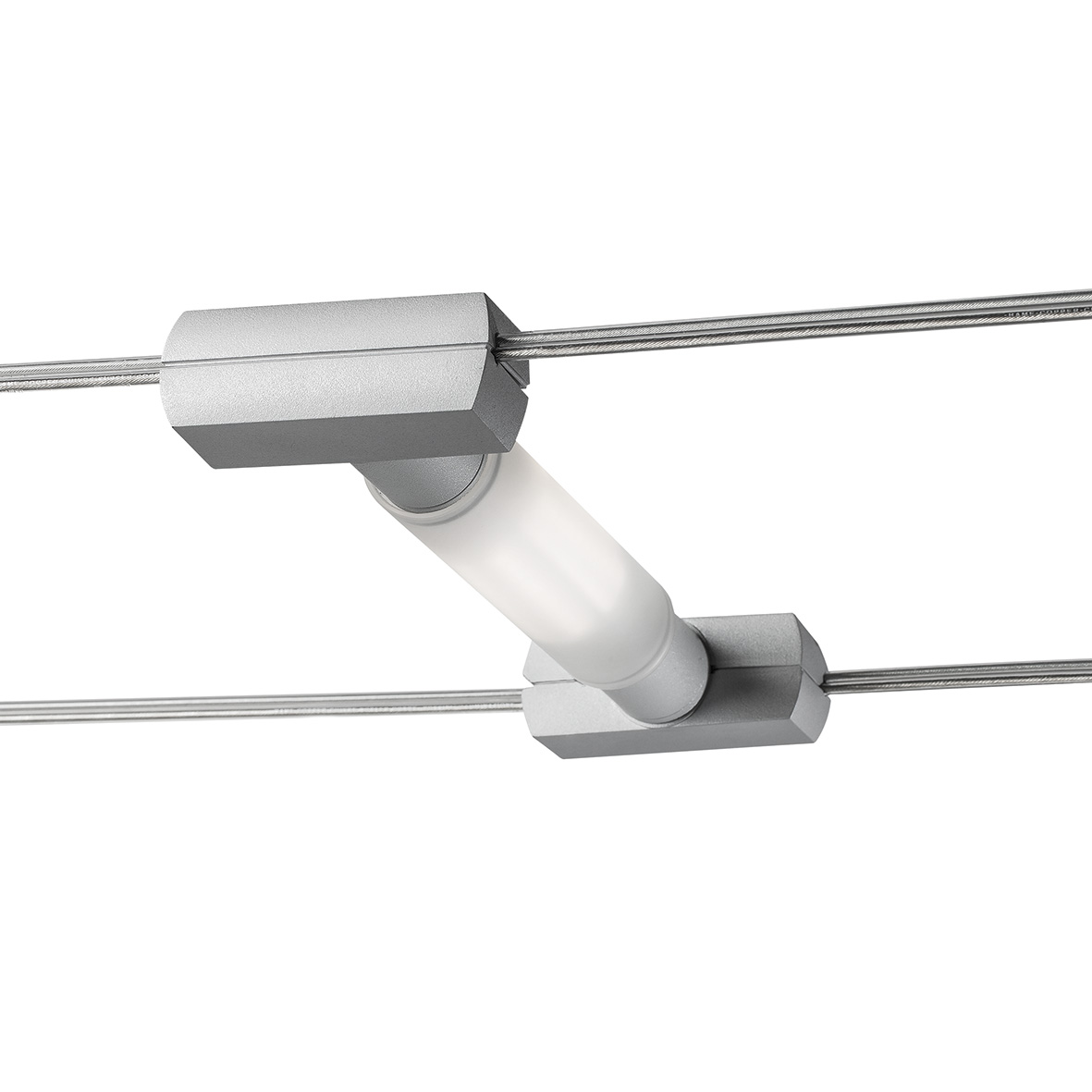 Sistema a tesata con coppia di cavi con interasse 320mm: permette di installare apparecchi con fonte luminosa con LED integrato o con attacco tradizionale (GU10, R7s, E27 che consentono di montare lampadina LED, alogena o a risparmio energetico). Corpi illuminanti, da posizionare secondo le esigenze di installazione, in estruso di alluminio (verniciato bianco opaco o grigio opaco) e diffusore in policarbonato. Disponibili in versione luce diffusa, monoemissione o biemissione (da pag. 300 a pag. 304) o a spot con corpo illuminante orientabile su due assi di ?35? e ?90?. LED disponibile in due gradazioni (3000K e 4000K).