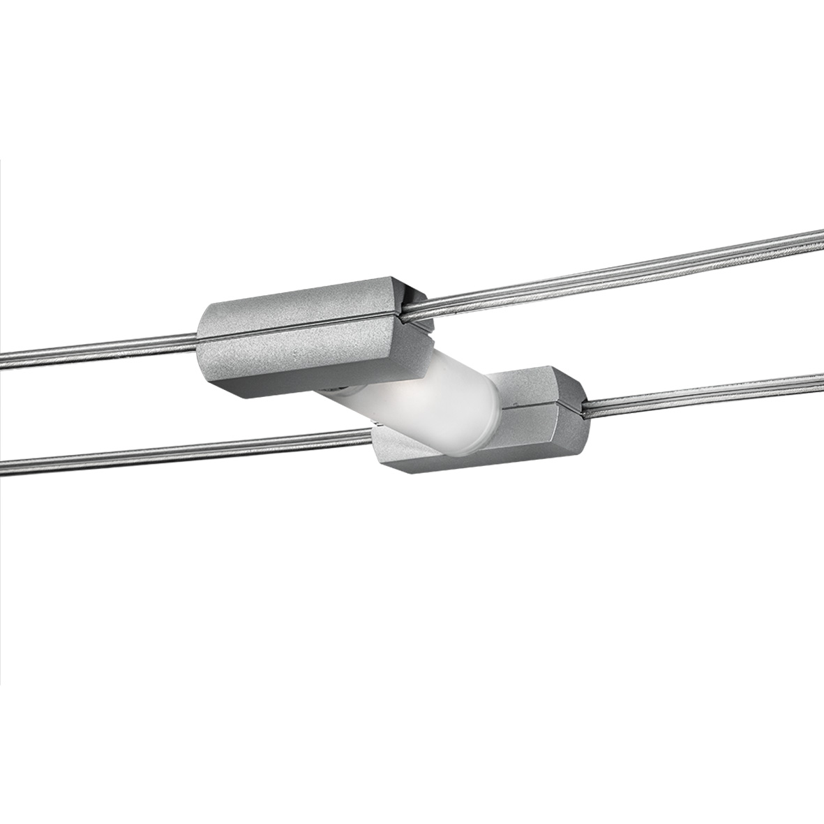 Sistema a tesata con coppia di cavi con interasse 160mm: permette di installare apparecchi con fonte luminosa con LED integrato o con attacco tradizionale (GU10, R7s, E27 che consentono di montare lampadina LED, alogena o a risparmio energetico). Corpi illuminanti, da posizionare secondo le esigenze di installazione, in estruso di alluminio (verniciato bianco opaco o grigio opaco) e diffusore in policarbonato. Disponibili in versione luce diffusa, monoemissione o biemissione o a spot con corpo illuminante orientabile su due assi di ?35? e ?90?. LED disponibile in due gradazioni (3000K e 4000K).