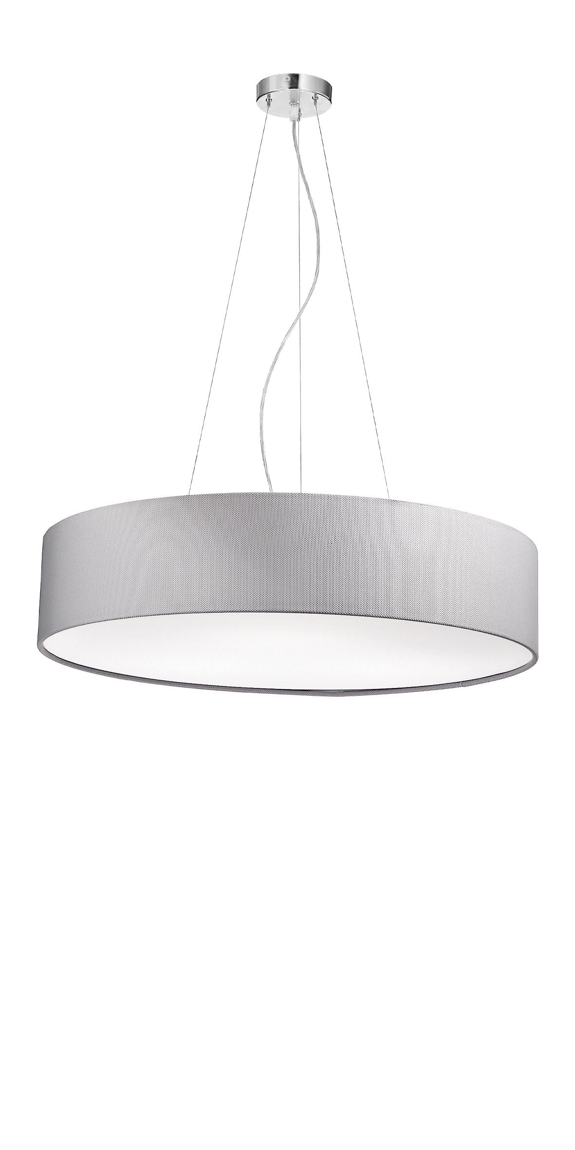 Lampada a sospensione, a soffitto, da parete, da tavolo e da terra con paralume in tessuto trevira ignifugo. Struttura in metallo verniciato bianco opaco con particolari cromo. Tappo di chiusura per sospensione e plafoniera in PVC coperto da tessuto, la versione a soffitto con sbraccio ruota di 355?. Disponibile in due finiture (avorio e grigio), in versione LED (2700K) o con attacco tradizionale (E27) che consente di montare lampadina LED.
