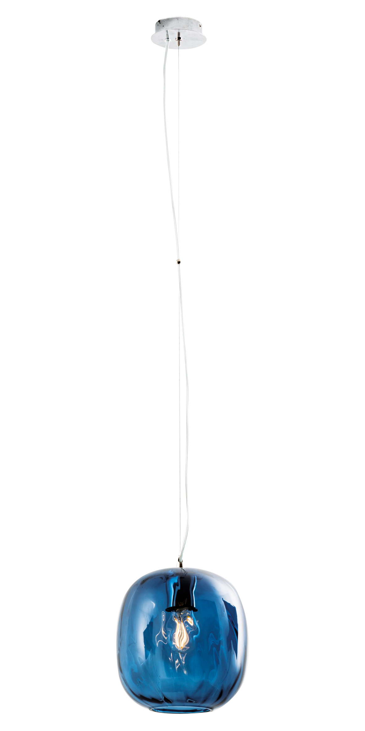 Lampada a sospensione composta da un prezioso diffusore in vetro trasparente soffiato a mano, dalla forma tondeggiante e martellato sulla superficie, con un effetto particolare che movimenta le linee del prodotto e crea particolari effetti di luce sulla superficie di installazione. Disponibile in tre finiture (trasparente, fum? e blu), proposta in versione singola o con rosone per cadute multiple a tre elementi. Cablato con attacco E27 con lampadina visibile in virt? della trasparenza del prodotto, che consente all’utente di montare una lampadina a sua scelta, personalizzando ulteriormente il prodotto.