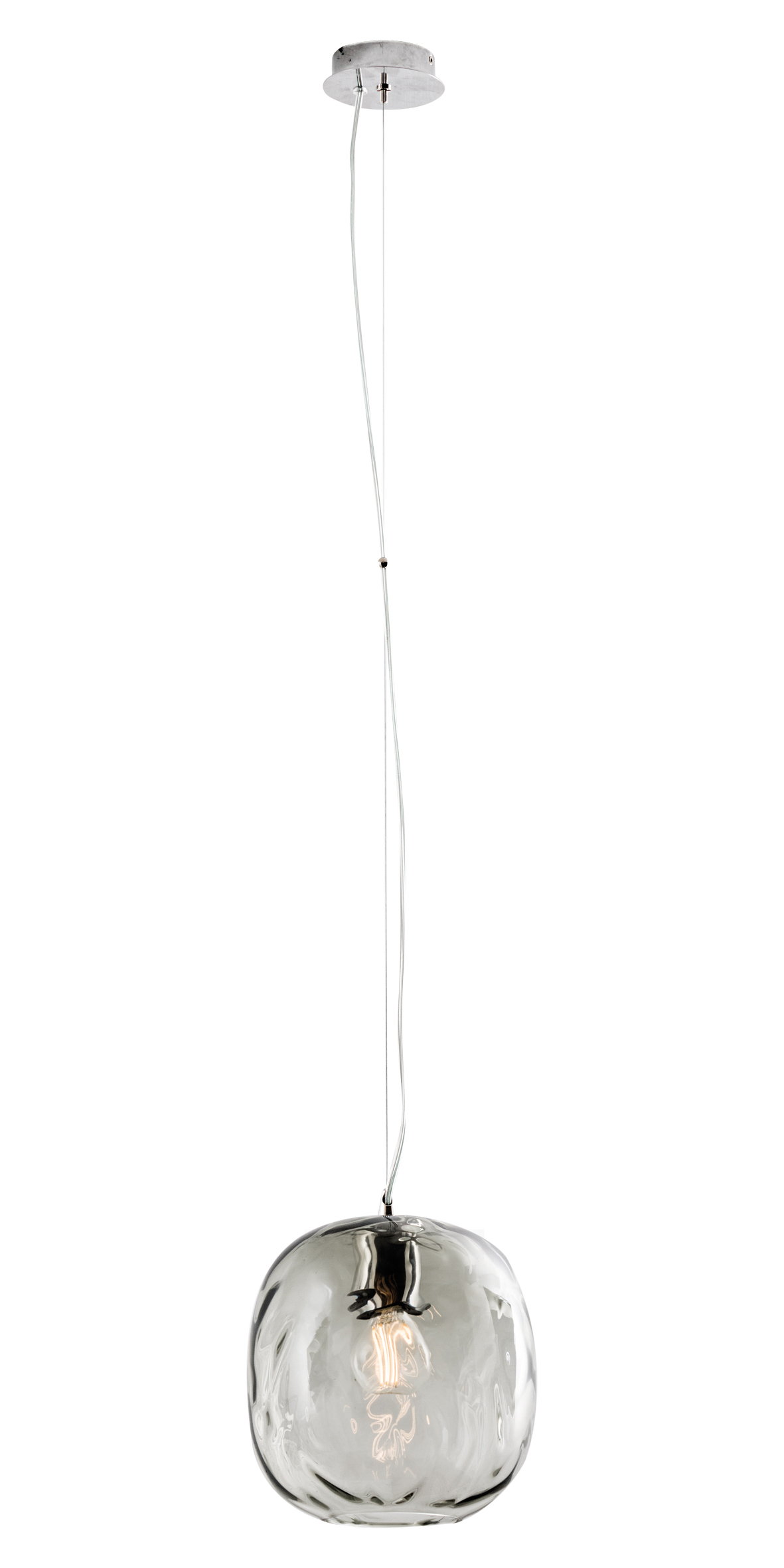 Lampada a sospensione composta da un prezioso diffusore in vetro trasparente soffiato a mano, dalla forma tondeggiante e martellato sulla superficie, con un effetto particolare che movimenta le linee del prodotto e crea particolari effetti di luce sulla superficie di installazione. Disponibile in tre finiture (trasparente, fum? e blu), proposta in versione singola o con rosone per cadute multiple a tre elementi. Cablato con attacco E27 con lampadina visibile in virt? della trasparenza del prodotto, che consente all’utente di montare una lampadina a sua scelta, personalizzando ulteriormente il prodotto.