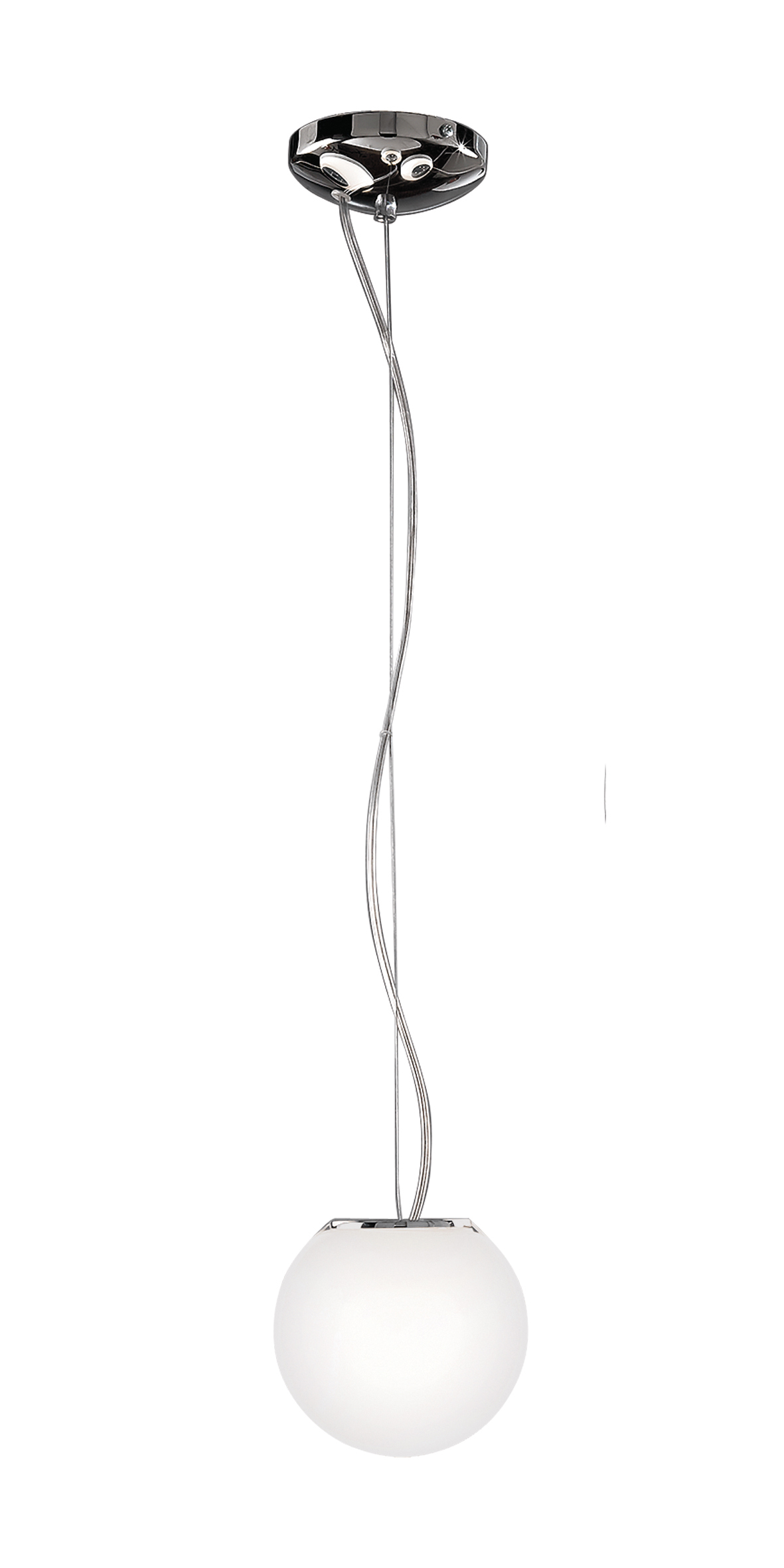 Lampada a sospensione, da soffitto, da tavolo e da terra con diffusore tondo in vetro soffiato satinato, per un’ottima diffusione della luce. Disponibile in diversi diametri, nella versione sospesa proposta in versione singola (con rosone bianco) o in caduta multipla a tre elementi con kit decentramento in finitura cromo (solo per le dimensioni mini e small). Plafoniera a grappolo a cinque elementi (struttura bianca).