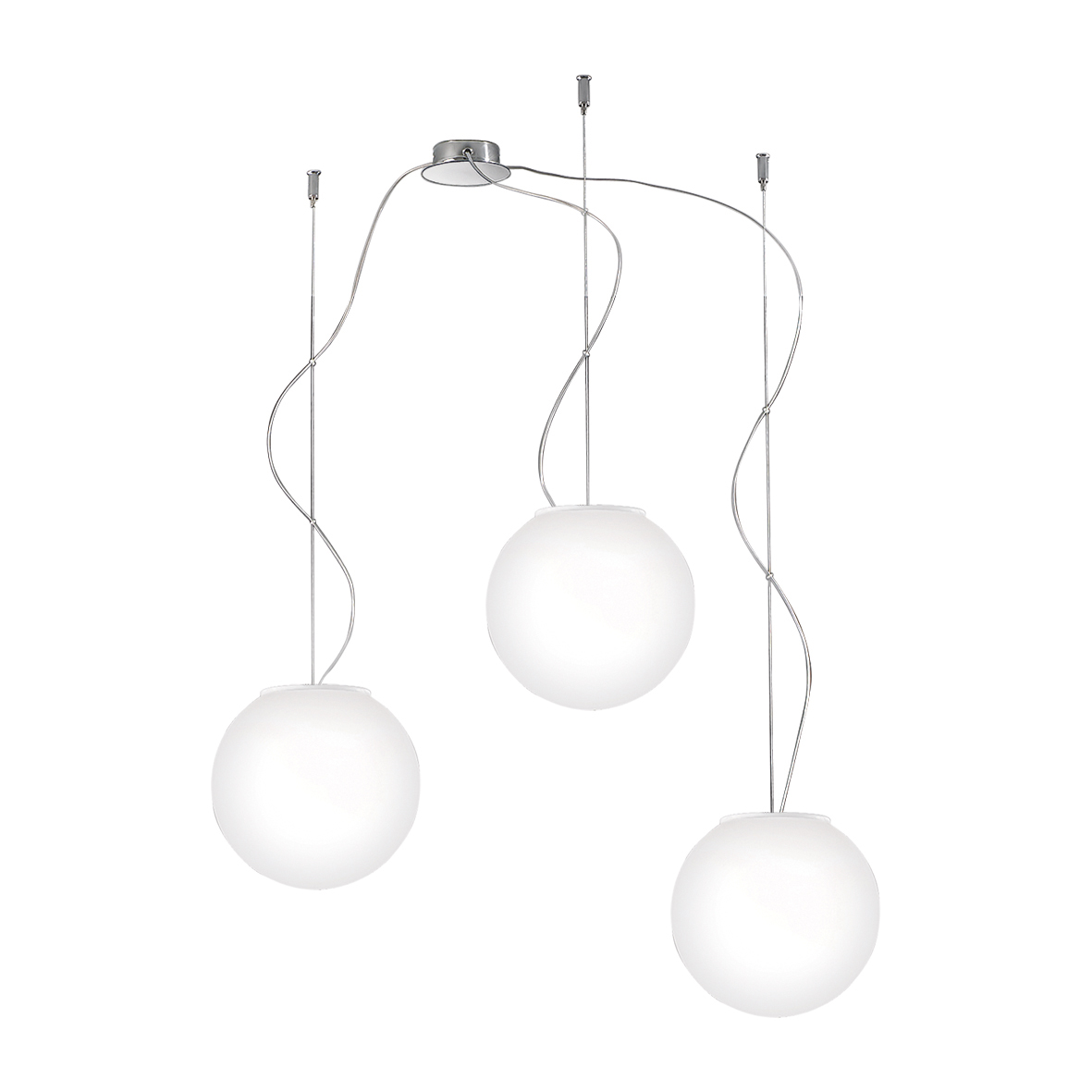 Lampada a sospensione, da soffitto, da tavolo e da terra con diffusore tondo in vetro soffiato satinato, per un’ottima diffusione della luce. Disponibile in diversi diametri, nella versione sospesa proposta in versione singola (con rosone bianco) o in caduta multipla a tre elementi con kit decentramento in finitura cromo (solo per le dimensioni mini e small). Plafoniera a grappolo a cinque elementi (struttura bianca).