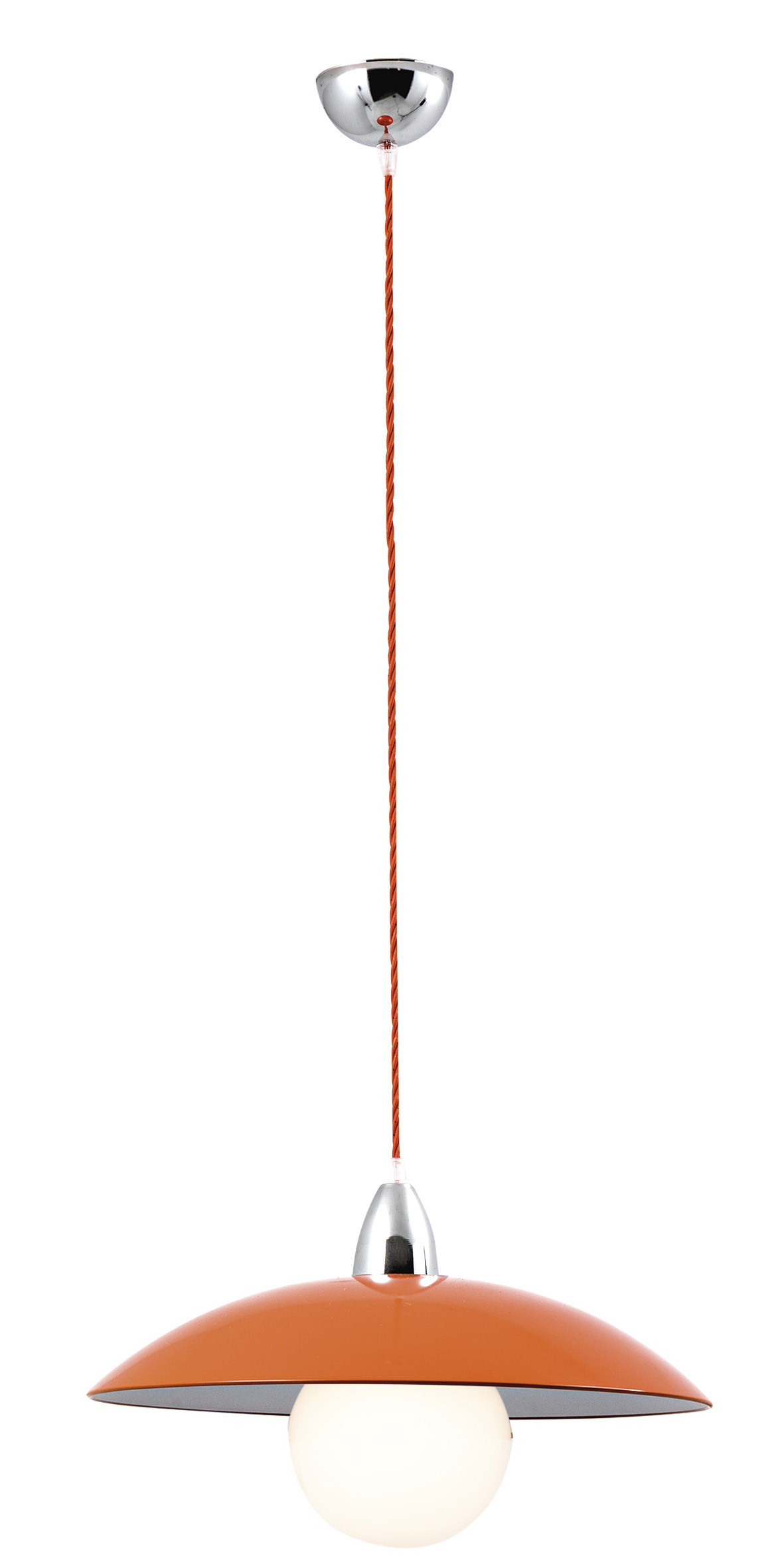 Lampada a sospensione e da parete con struttura in metallo cromato e diffusore in vetro lastra verniciato lucido. Disponibile in tre finiture (arancio, bianco e rosso), sospensione proposta in tre misure e con cavo in tinta con il corpo lampada.