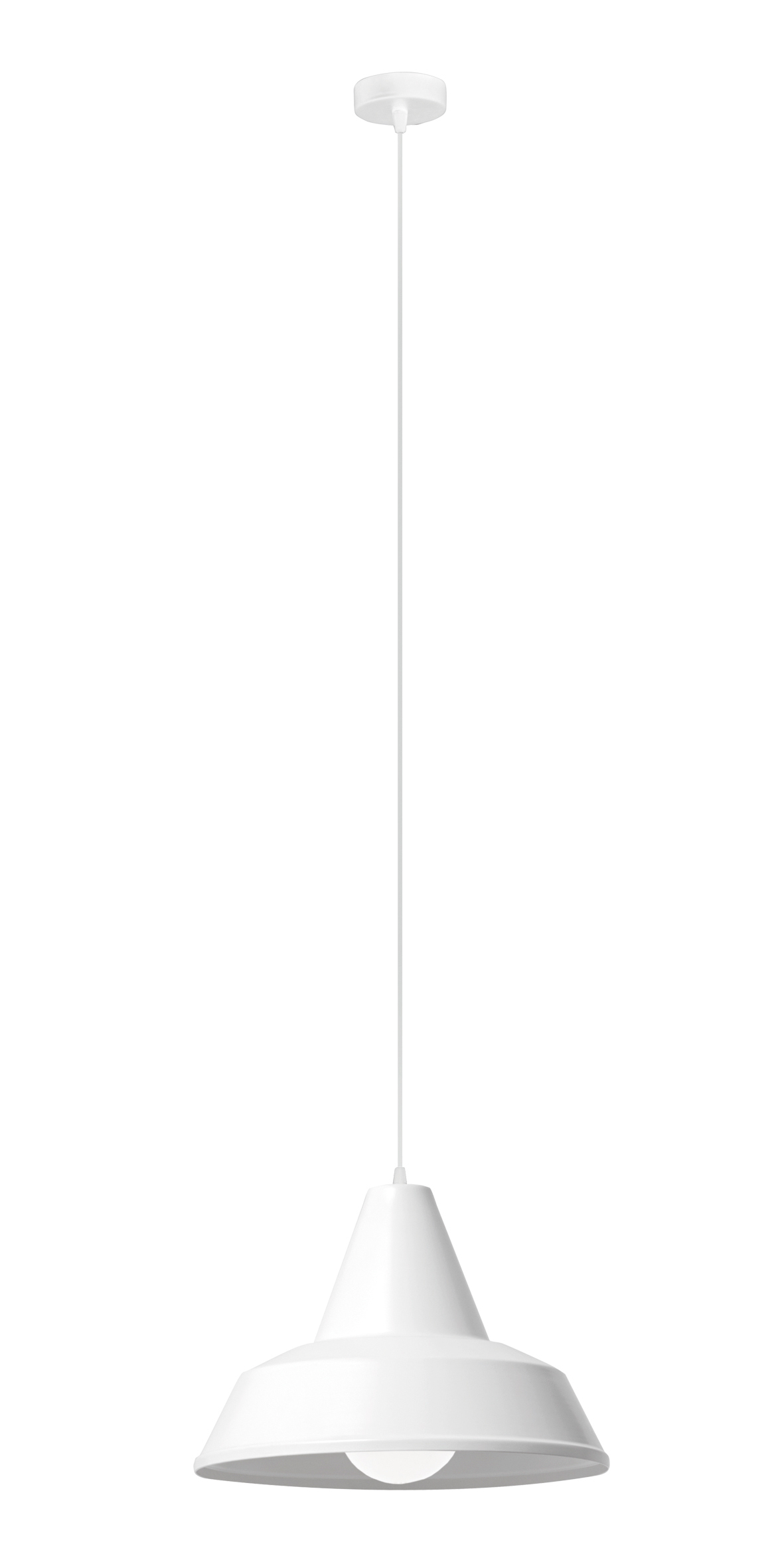 Lampada a sospensione con diffusore in metallo verniciato a polveri, dalla forma in stile industriale. Portalampada E27, che consente di montare una lampadina LED. Disponibile nei colori bianco, nero e bronzo, con interno e rosone in tinta. Cavo in PVC in tinta nelle versioni nera e bianca, cavo nero per la versione bronzo.