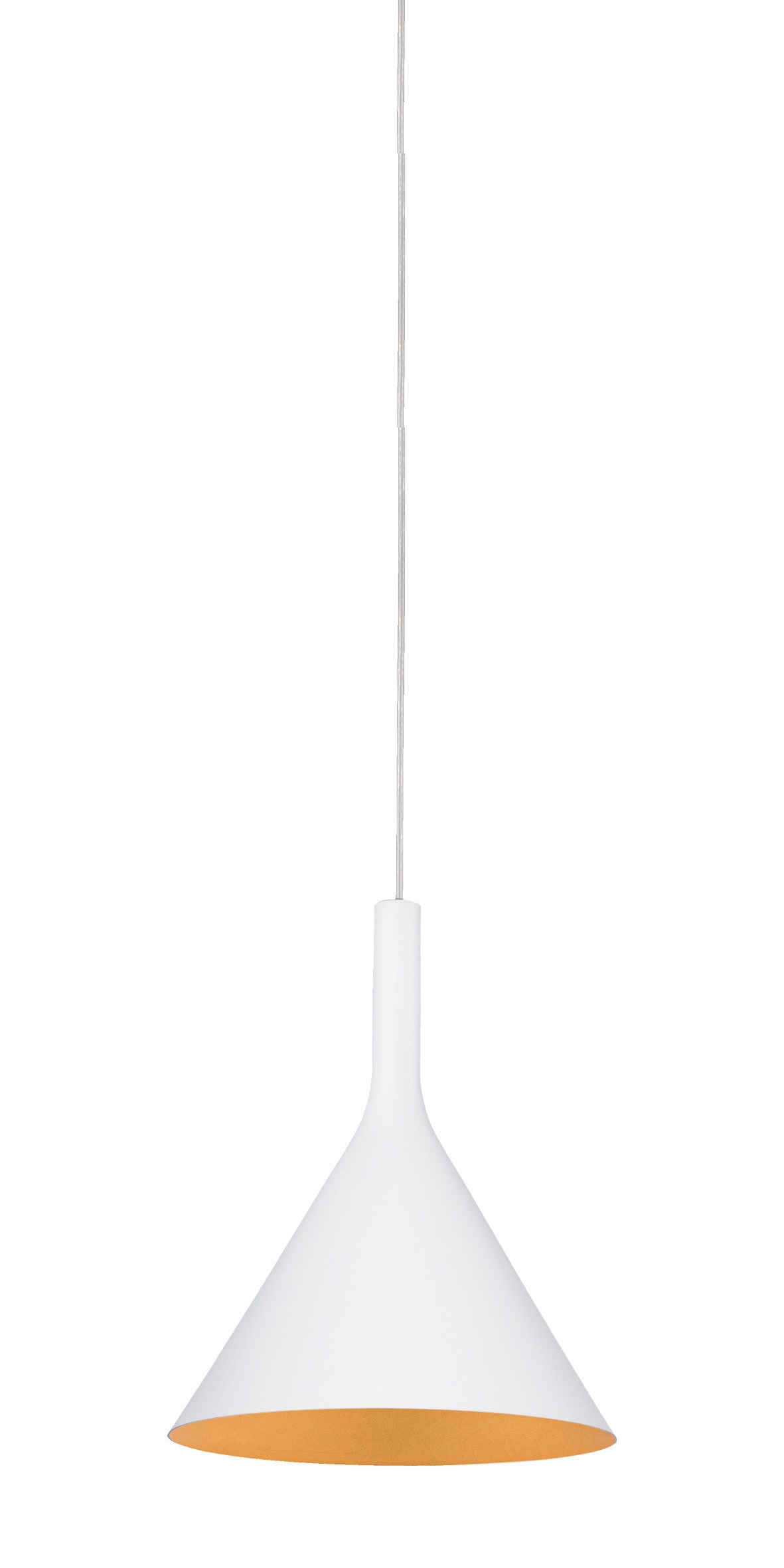 Elegante sospensione a forma conica in metallo verniciato a polveri, disponibile in finitura bianca o nera, con interno bianco o oro satinato. Disponibile in versione singola (cavo di sospensione nero o trasparente), con kit decentramento a tre o cinque elementi (cavo in tinta con il corpo lampada) o con possibilit? di decentramento dal punto luce, con effetto di disegno sulla superficie di montaggio. Cablata con attacco E27 che consente di montare lampadina LED.