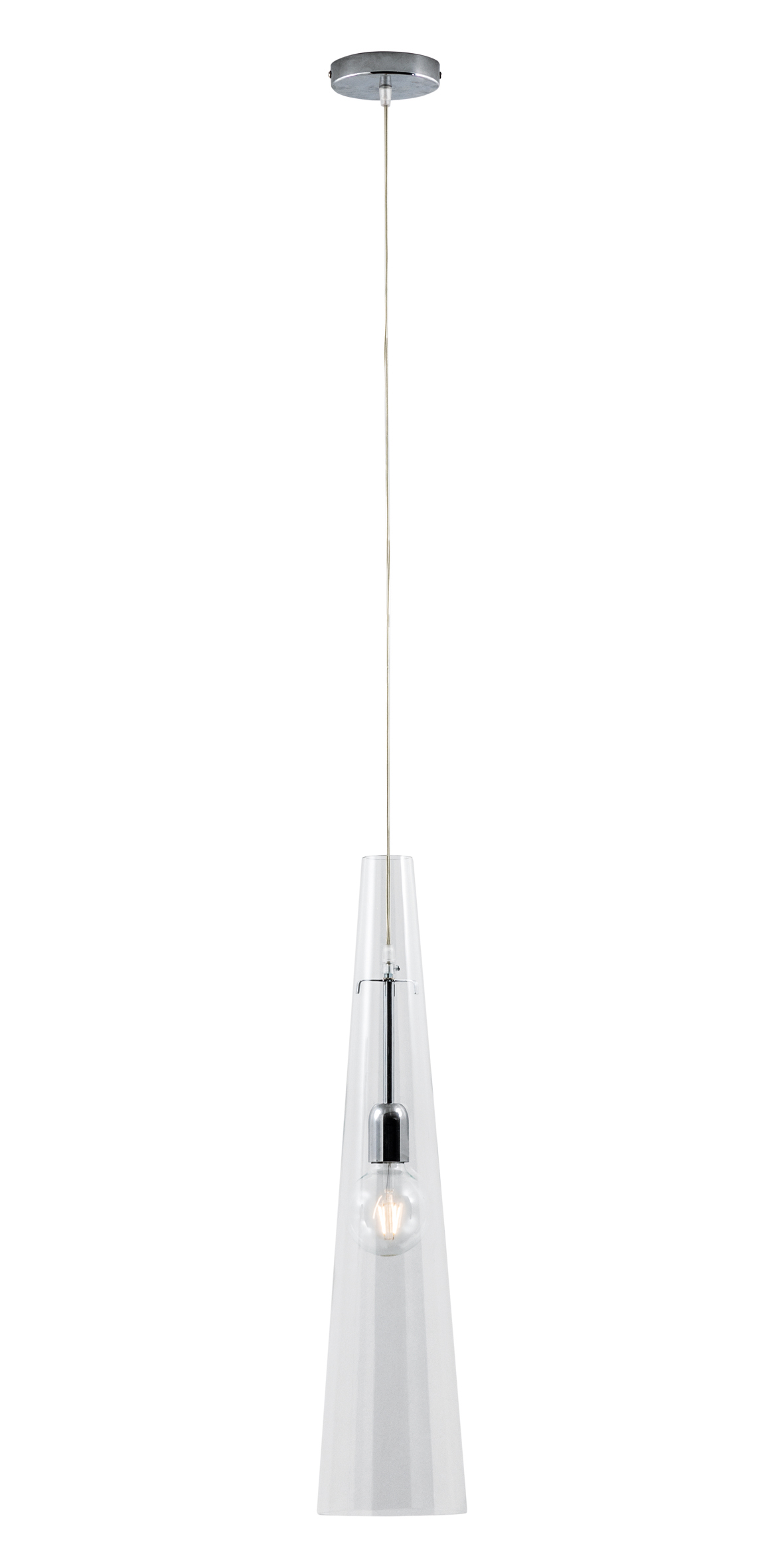 Lampada a sospensione con diffusore dalla forma conica in vetro soffiato cristallo trasparente. Struttura, portalampada e rosone in metallo cromato, cavo in PVC trasparente. Disponibile in due dimensioni