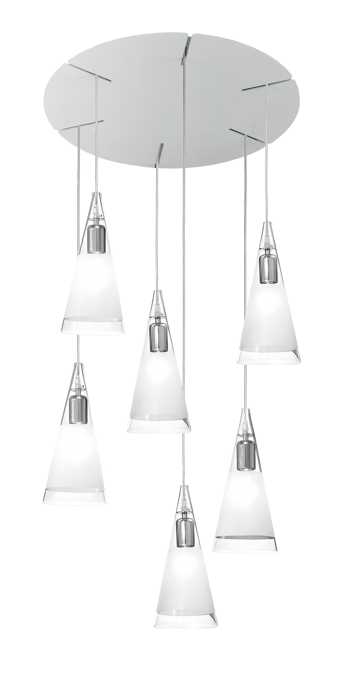 Lampada a sospensione a forma conica con diffusore in vetro soffiato cristallo con fascia satinata a copertura della fonte luminosa. Struttura e portalampada in metallo cromato. Disponibile nella versione singola e in cadute multiple, sia con rosone (a tre e sei elementi), che con kit decentramento (a tre e cinque elementi), che con barra lineare (a tre e quattro elementi).