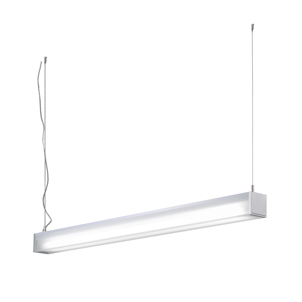 Sospensione fluorescente T5. Struttura in alluminio verniciato grigio e diffusore inferiore in policarbonato satinato. I lati della struttura sono in metacrilato.