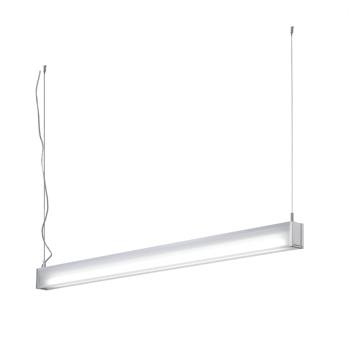 Sospensione fluorescente T5. Struttura in alluminio verniciato grigio e diffusore inferiore in policarbonato satinato. I lati della struttura sono in metacrilato.