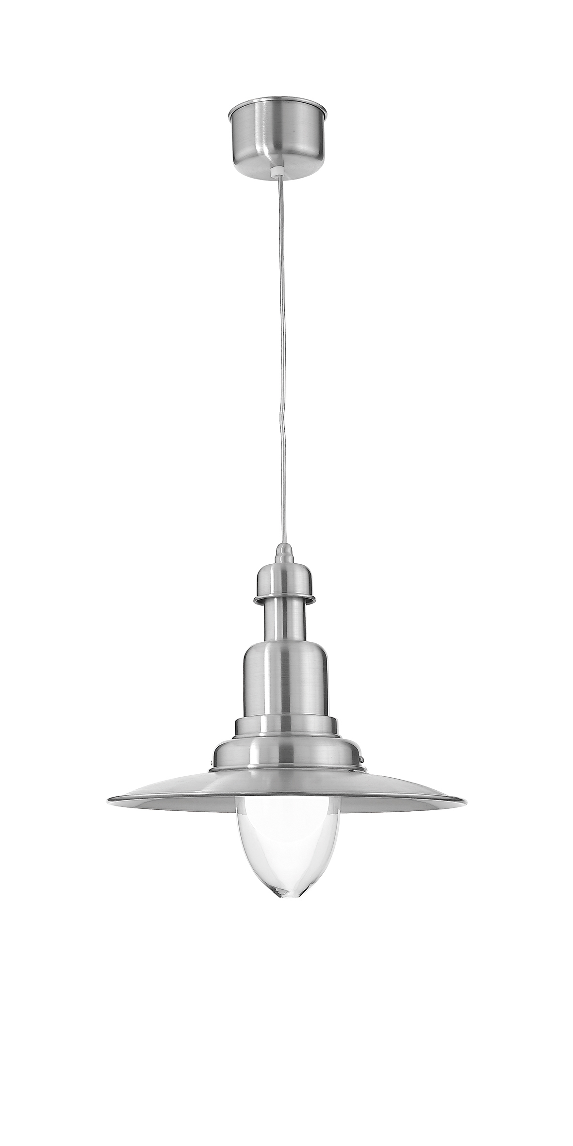 Lampada a sospensione in alluminio dalla forma in stile industriale e diffusore in vetro trasparente. Disponibile nelle finiture bianco, grigio, nero, oro satinato e rame. Cavo in PVC trasparente, rosone in tinta. Attacco E27 che consente di montare lampadina LED.