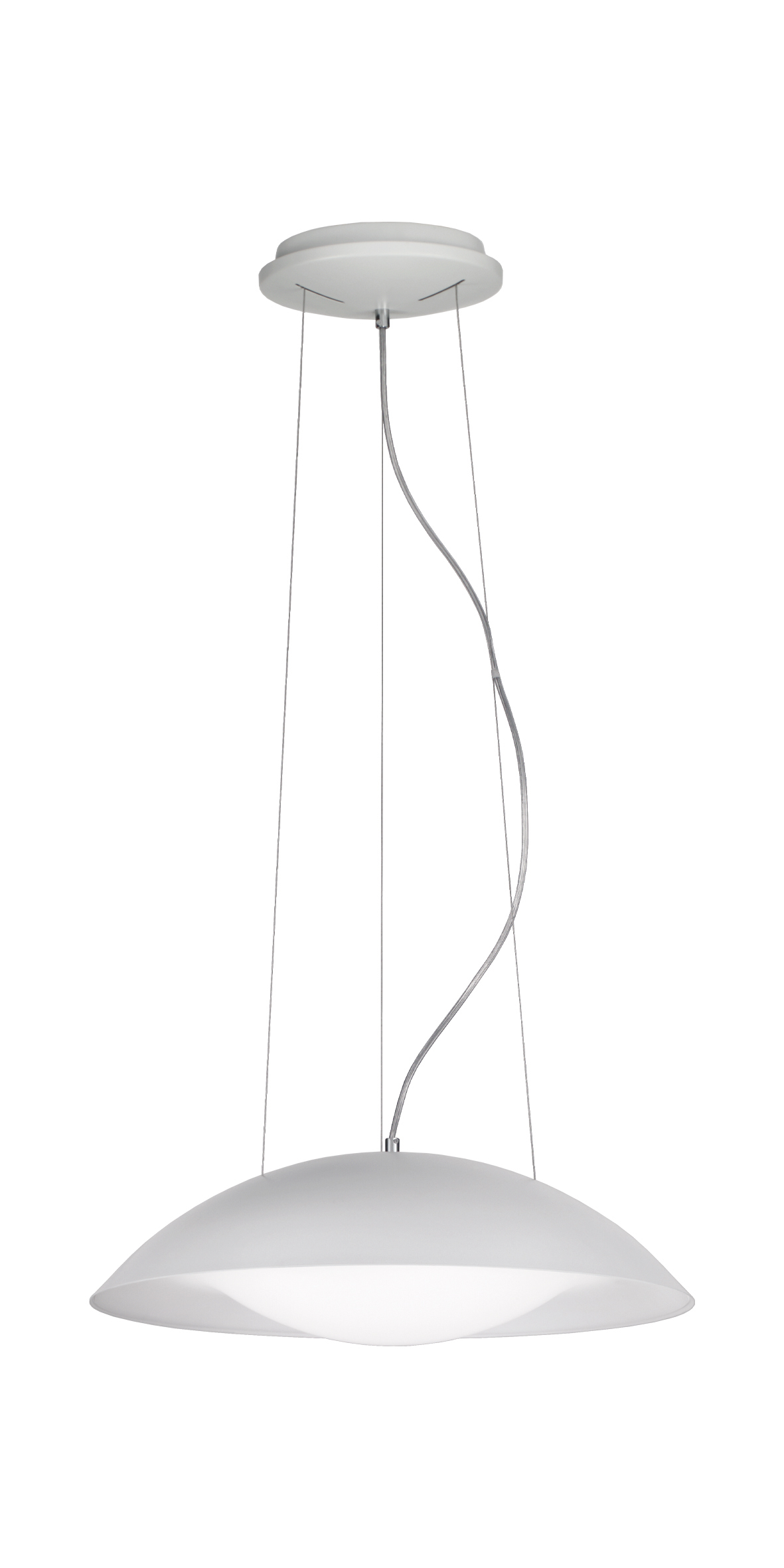 Elegante lampada a sospensione con sorgente LED integrata (3000K), struttura in metallo verniciato (in finitura bianca o nera) e sinuoso diffusore in metacrilato bianco che consente un’ottima diffusione della luce.