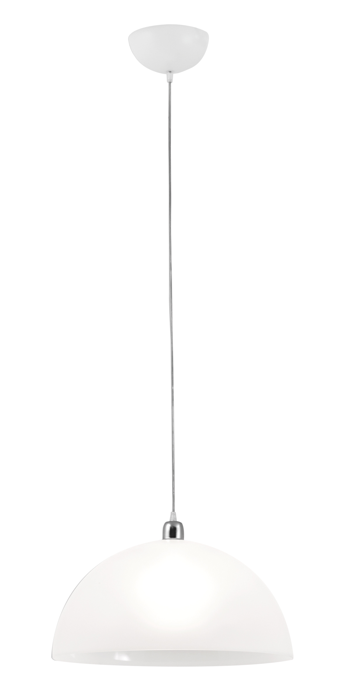 Lampada a sospensione semi-sfera in metacrilato, disponibile in quattro finiture: rosso trasparente, bianco satinato, bianco lucido e grigio fum?. Rosone in tinta, portalampada cromato. Attacco E27 che consente di montare lampadina LED.