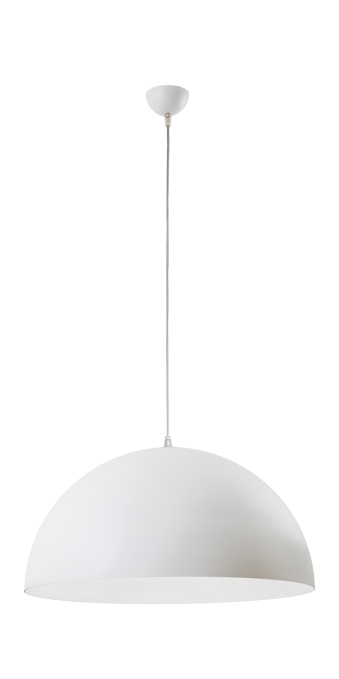 Lampada a sospensione semisfera in metallo verniciato disponibile nei colori bianco (con interno bianco) e nero (con interno bianco o oro). Particolari e rosone in tinta con il diffusore, cavo della sospensione in PVC trasparente. Cablata con attacco E27 che consente di montare lampadina LED.