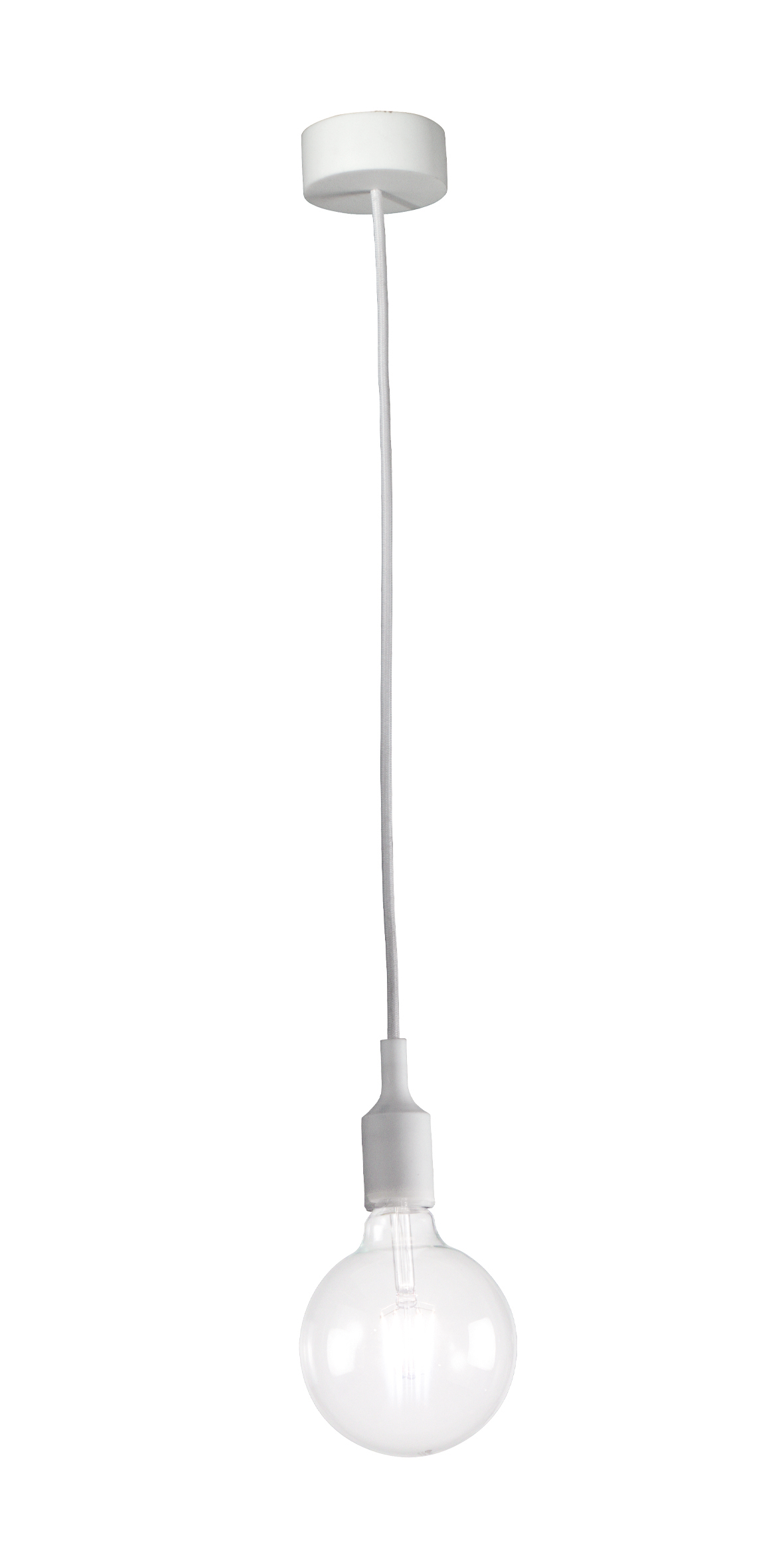 Lampada a sospensione singola con portalampada in silicone e cavo in tessuto, in tinta con la struttura e il rosone. Attacco E27 con lampadina a vista, che consente all’utente di montare una lampadina a sua scelta, personalizzando ulteriormente il prodotto. Proposta nelle finiture bianca, nera, grigia, rossa e gialla.