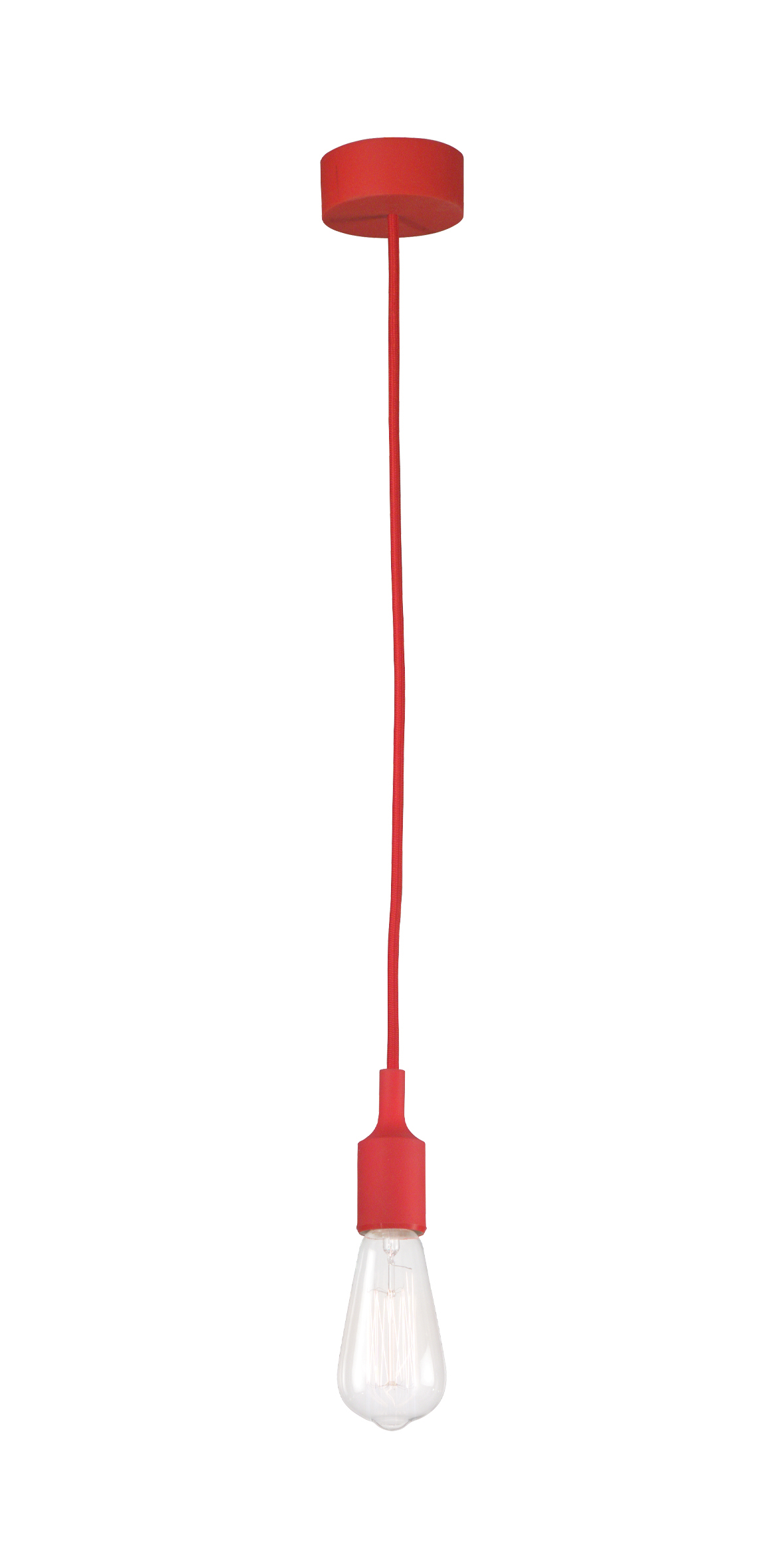 Lampada a sospensione singola con portalampada in silicone e cavo in tessuto, in tinta con la struttura e il rosone. Attacco E27 con lampadina a vista, che consente all’utente di montare una lampadina a sua scelta, personalizzando ulteriormente il prodotto. Proposta nelle finiture bianca, nera, grigia, rossa e gialla.
