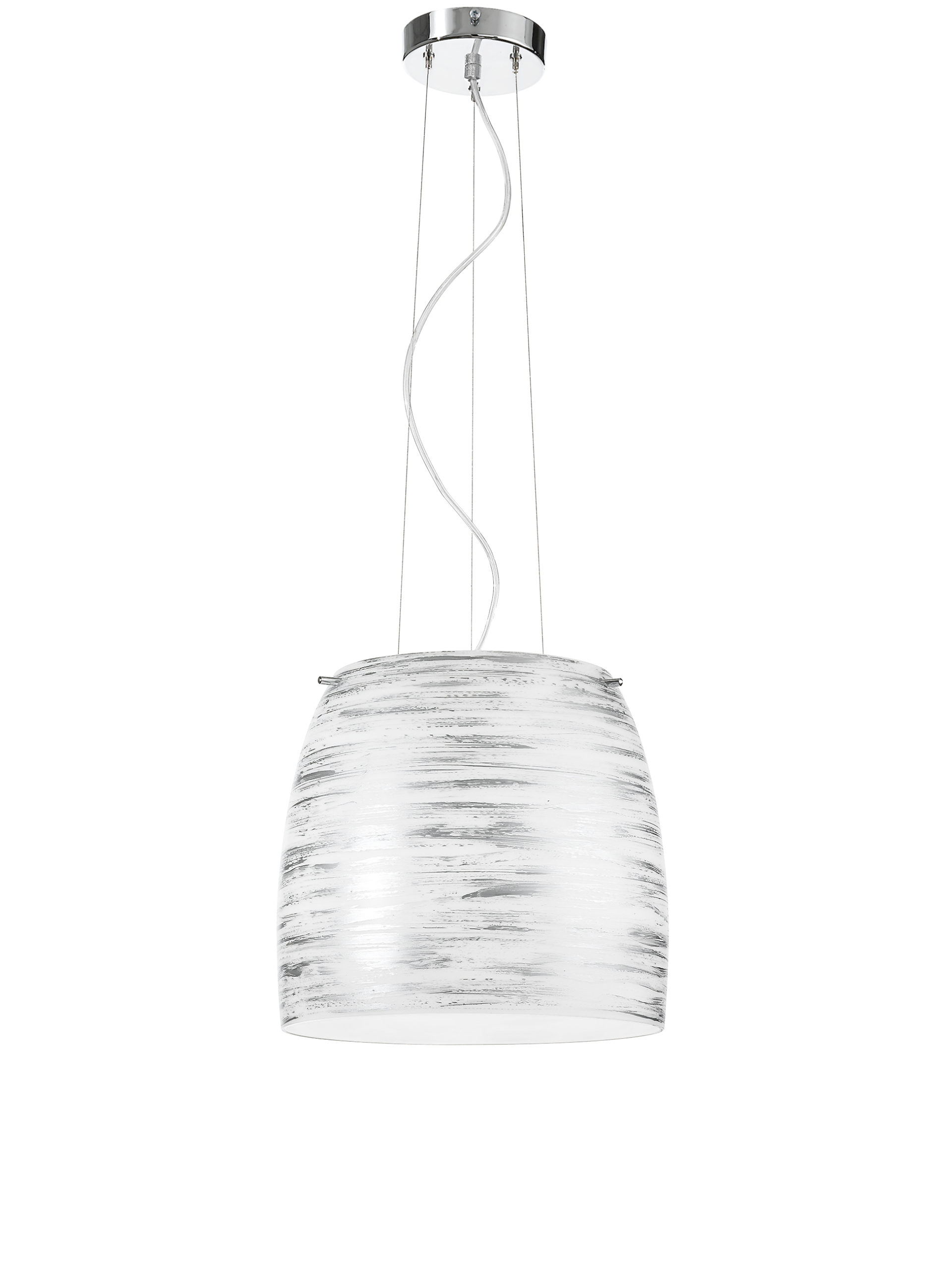 Lampada a sospensione e da parete in vetro satinato con decoro argento realizzato a mano. Struttura e finiture cromate. Sospensione disponibile in tre misure. Cablata con attacco E27 che consente di montare lampadina LED.
