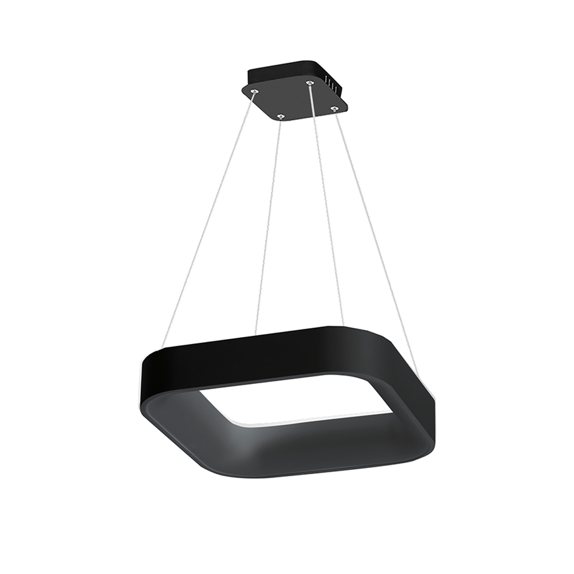 Lampada a sospensione e a soffitto in metallo verniciato bianco o nero con sorgente LED (3000K). Proposta in forma tonda o squadrata, la versione a sospensione ? vuota al centro, nella versione a soffitto (disponibile in forma tonda o squadrata) la struttura in metallo bianca continua nella parte centrale. Diffusore in metacrilato che consente un’ottima diffusione della luce.