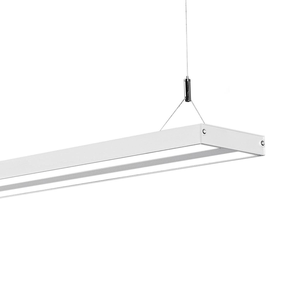 Sospensione LED monoemissione a due elementi. Struttura in alluminio verniciato bianco e diffusori in policarbonato satinato. Cavo di sospensione elettrico 1500mm incluso. Alimentatore integrato. Disponibile in due gradazioni colore (3000K e 4000K).
