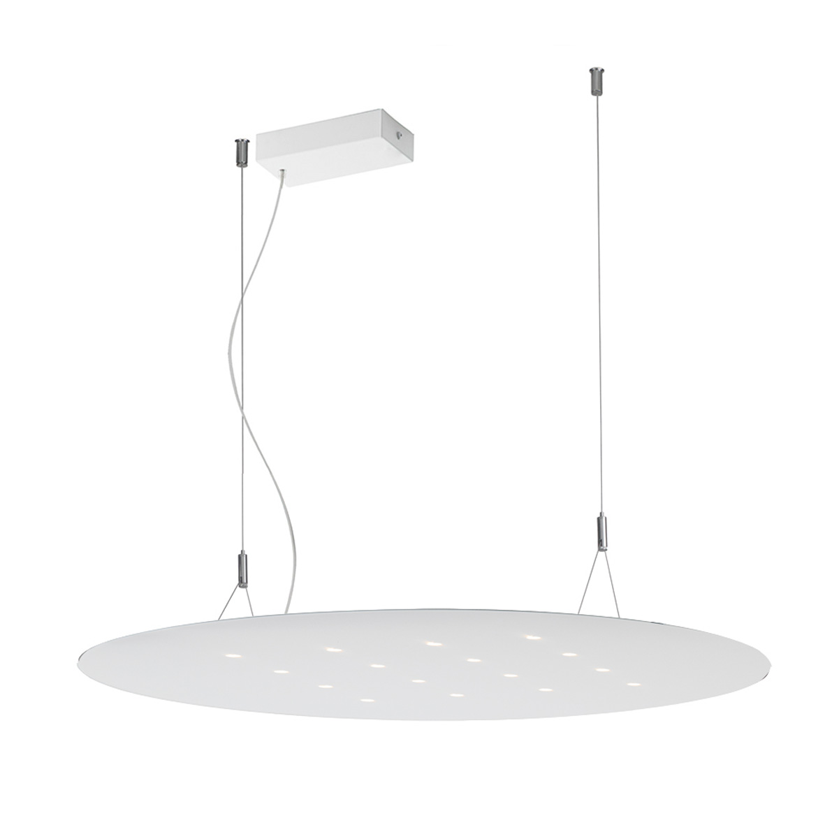 Lampada a soffitto e a sospensione con sorgente LED (3000K) con emissione diretta proposta in forma tonda o squadrata, in diverse misure e relative potenze, verniciata a polvere nei colori bianco opaco e nero opaco. Corpo in lamiera di acciaio molto sottile (spessore 2,5mm). Alimentatore dimmerabile (DALI) integrato.