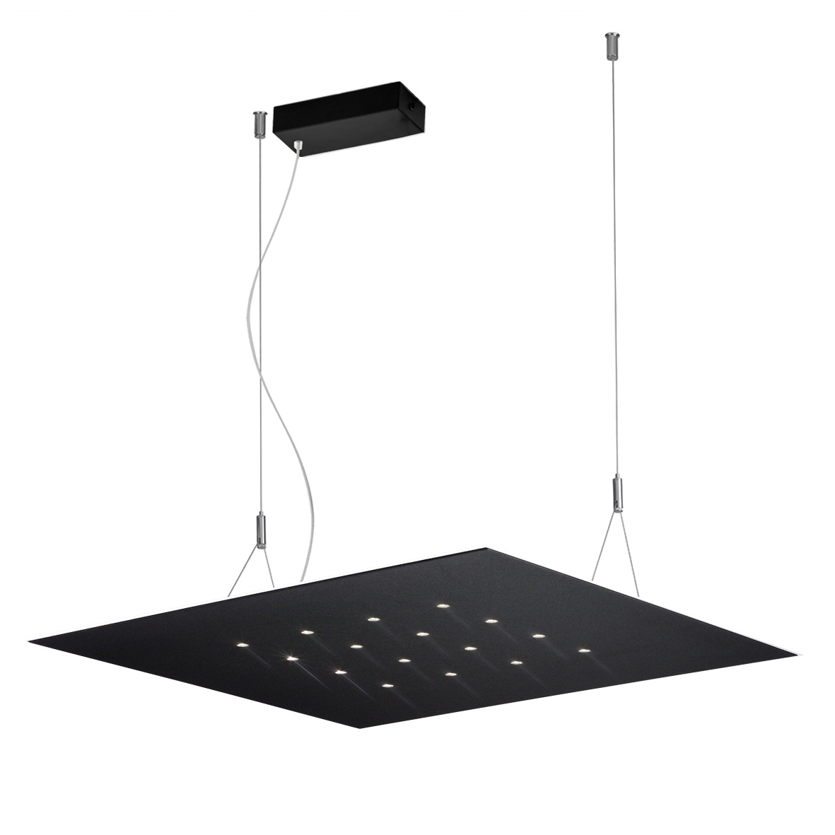 Lampada a soffitto e a sospensione con sorgente LED (3000K) con emissione diretta proposta in forma tonda o squadrata, in diverse misure e relative potenze, verniciata a polvere nei colori bianco opaco e nero opaco. Corpo in lamiera di acciaio molto sottile (spessore 2,5mm). Alimentatore dimmerabile (DALI) integrato.